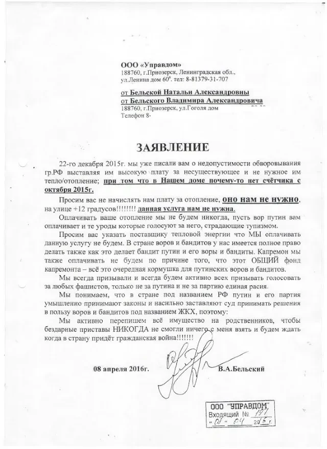 Стилистика заявлений Бельского такова (орфография и пунктуация автора сохранены. — Н. П.): «Капремонт мы также оплачивать не будем по причине того, что этот ОБЩИЙ фонд капремонта — всё это очередная кормушка для путинских воров и бандитов… Мы активно перепишем всё имущество на родственников, чтобы бездарные приставы НИКОГДА не смогли ничего с меня взять и будем ждать когда в страну придёт гражданская война!!!!!!!»