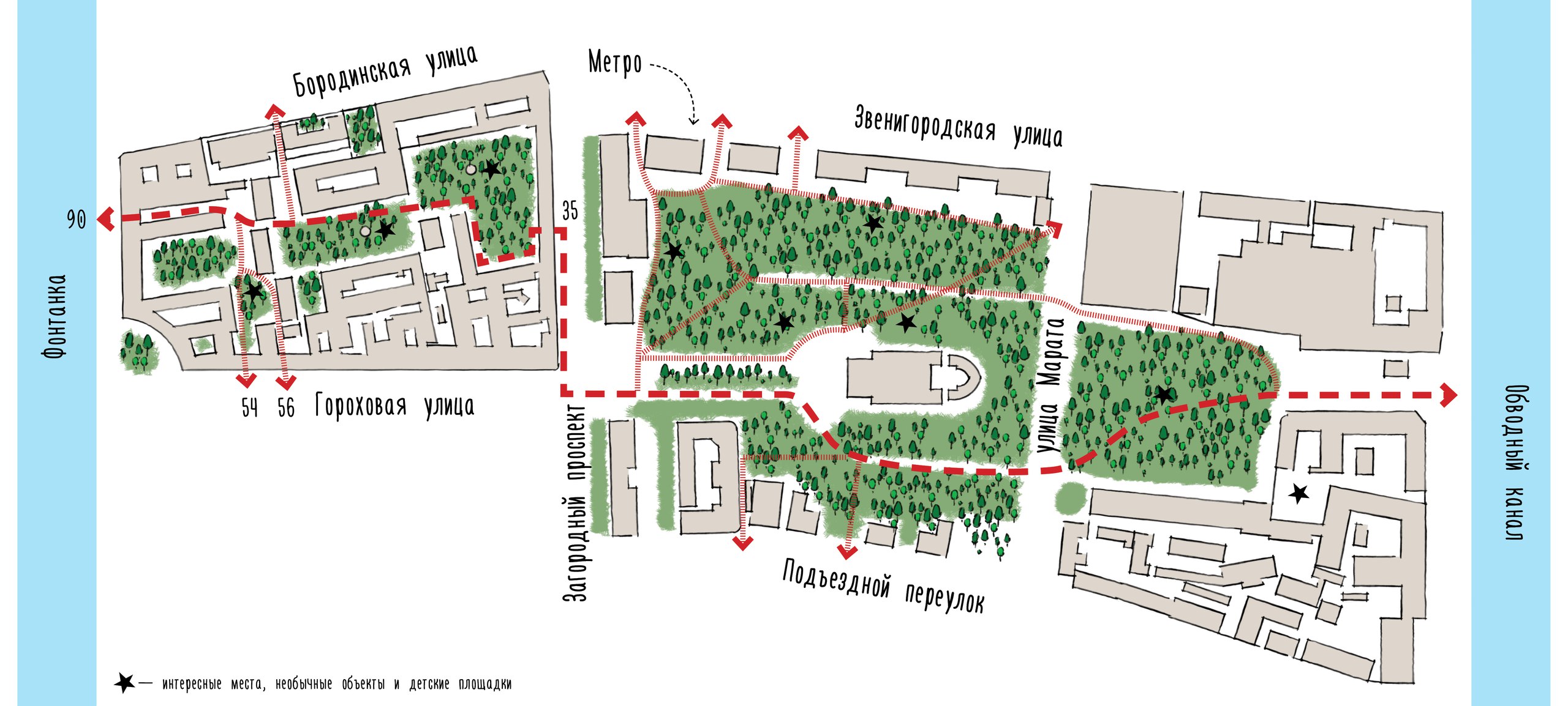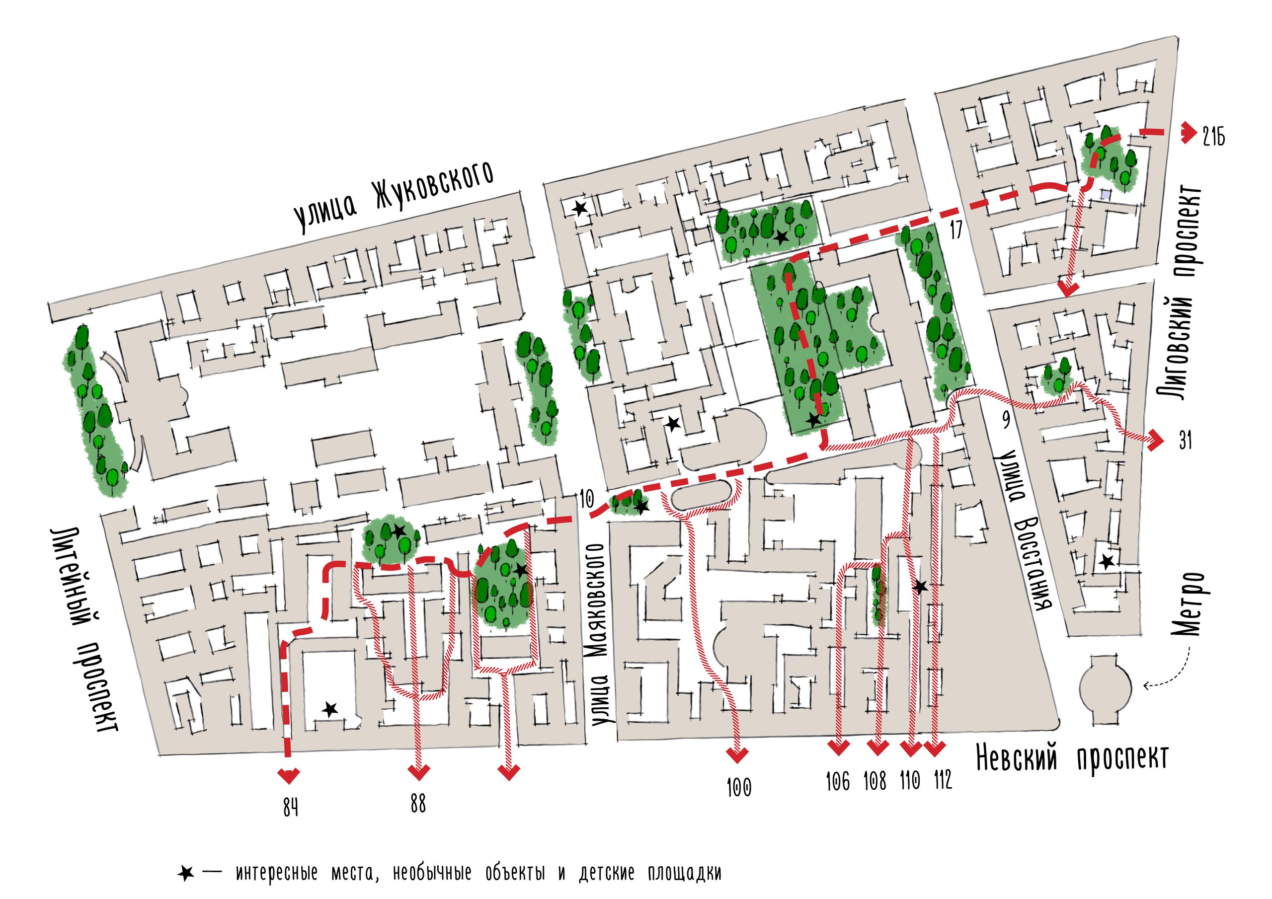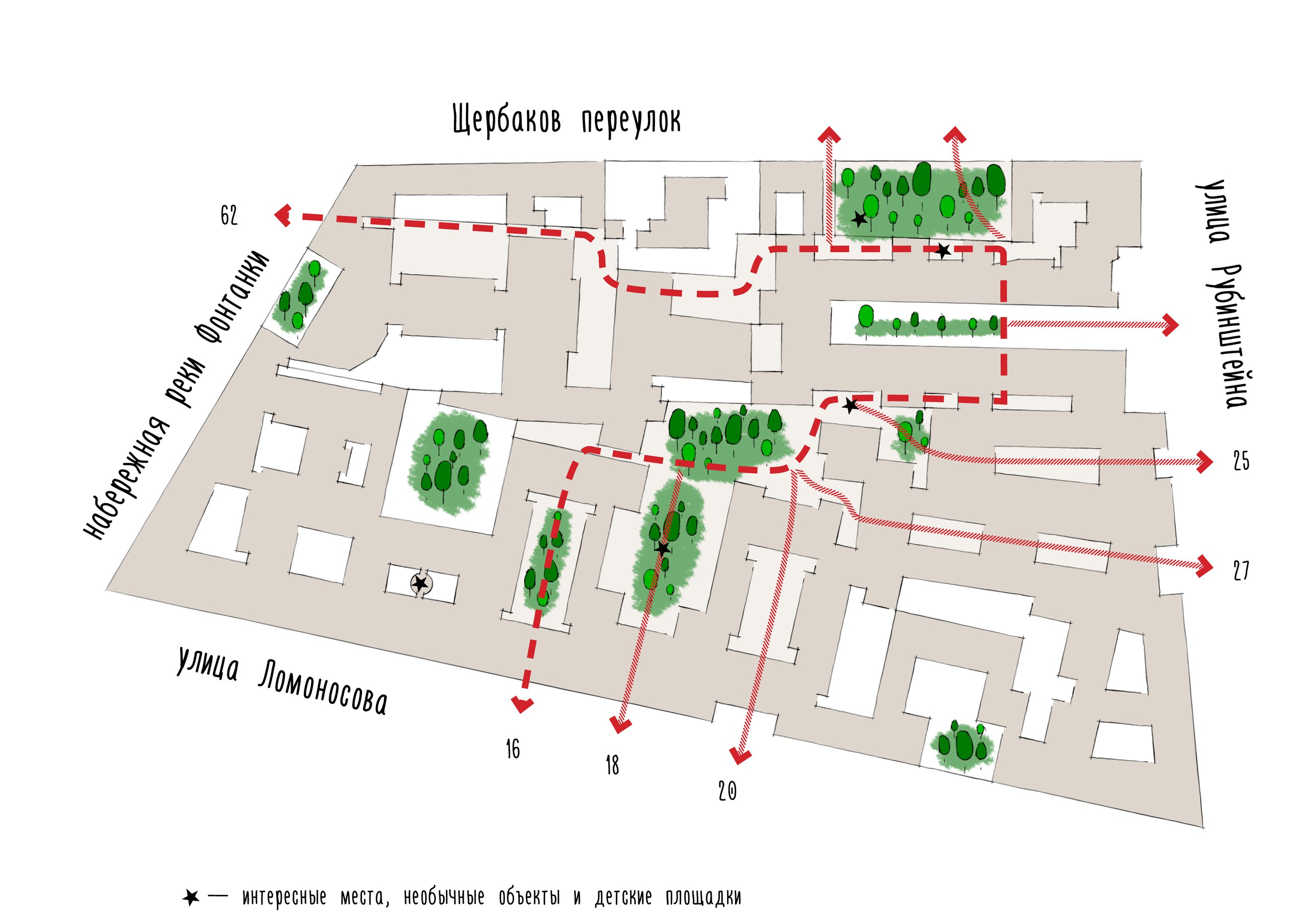 Пока готовы карты по трем направлениям: от Литейного проспекта до Лиговского, от набережной Фонтанки до улицы Ломоносова через дворы улицы Рубинштейна и от Фонтанки до Обводного канала.