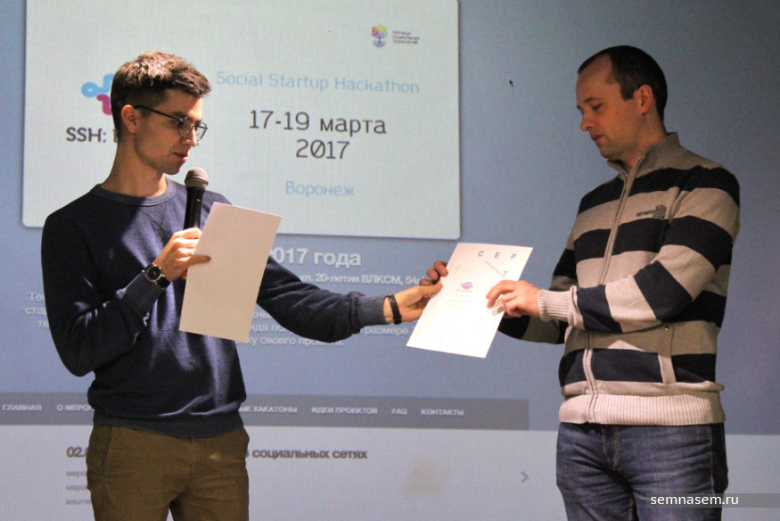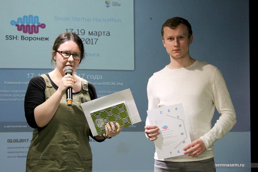 В книжном клубе «Петровский» в Воронеже состоялся первый хакатон «SSH: Воронеж» — конкурс и творческая мастерская проектов для решения важных общественных проблем и улучшения жизни в городе с помощью современных информационных технологий и интернета. Участникам предстояло разработать проекты за три дня — с 17 по 19 марта. По итогам работы мастерской жюри выбрало лучший проект, на доработку которого победившей команде выделили грант в 70 тыс. руб.