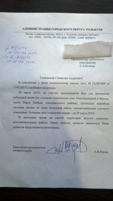 Мэрия города в качестве причины отказа в согласовании митинга назвала аварийную ситуацию, произошедшую 20 марта на участке, где должен состояться митинг. По словам представителей власти, «на площадке пересечения улиц Революционной и Фрунзе около Парка Победы Автозаводского района вышел из строя питающий кабель электроснабжения уличного освещения».