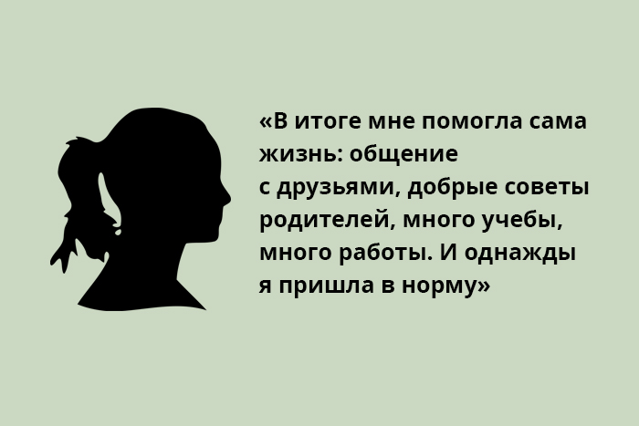 В итоге мне помогла сама жизнь: общение с друзьями, добрые советы родителей, много учебы, много работы. И однажды я пришла в норму. Это не значит, что всё решилось в одно мгновение: мама так и не нашла «нужных ключей», парень не стал встречаться со мной. Жизнь просто продолжилась. И это хорошо.