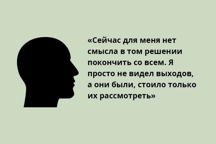 Сейчас я не вижу смысла в том решении покончить со всем. Я просто не видел выходов, а они были, стоило только их рассмотреть. В итоге я выжил, но целых три — долгих, страшных, отвратительных — месяца провел в психушке, где не мог выйти за дверь. Будто в тюрьме отсидел, честное слово. Самое глупое и бесполезное решение в моей жизни.
