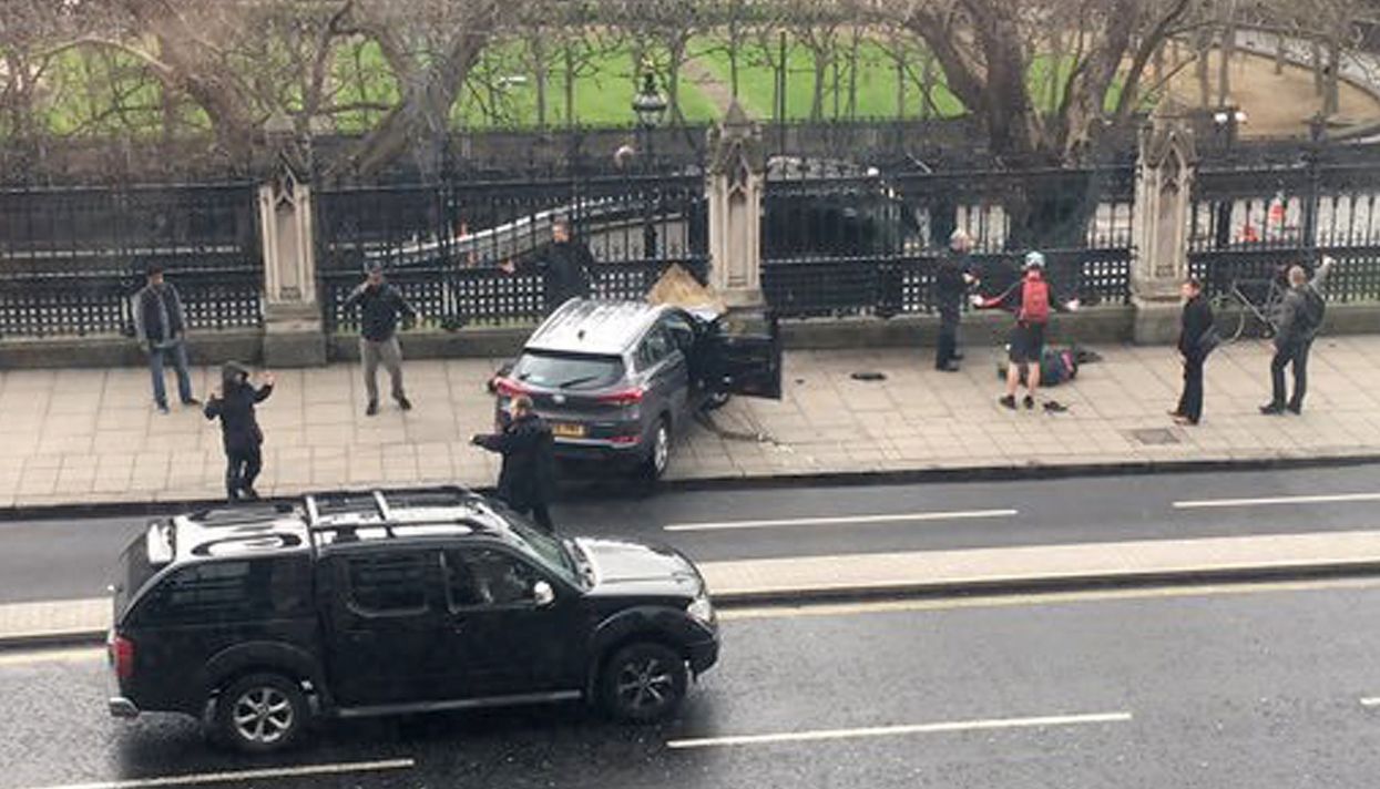 Фото: James West / AP / Scanpix / LETA Преступник сбил несколько человек и врезался в ограду парламента. После этого он вышел из машины и напал на полицейского с ножом. Лондон, 22 марта 2017 года