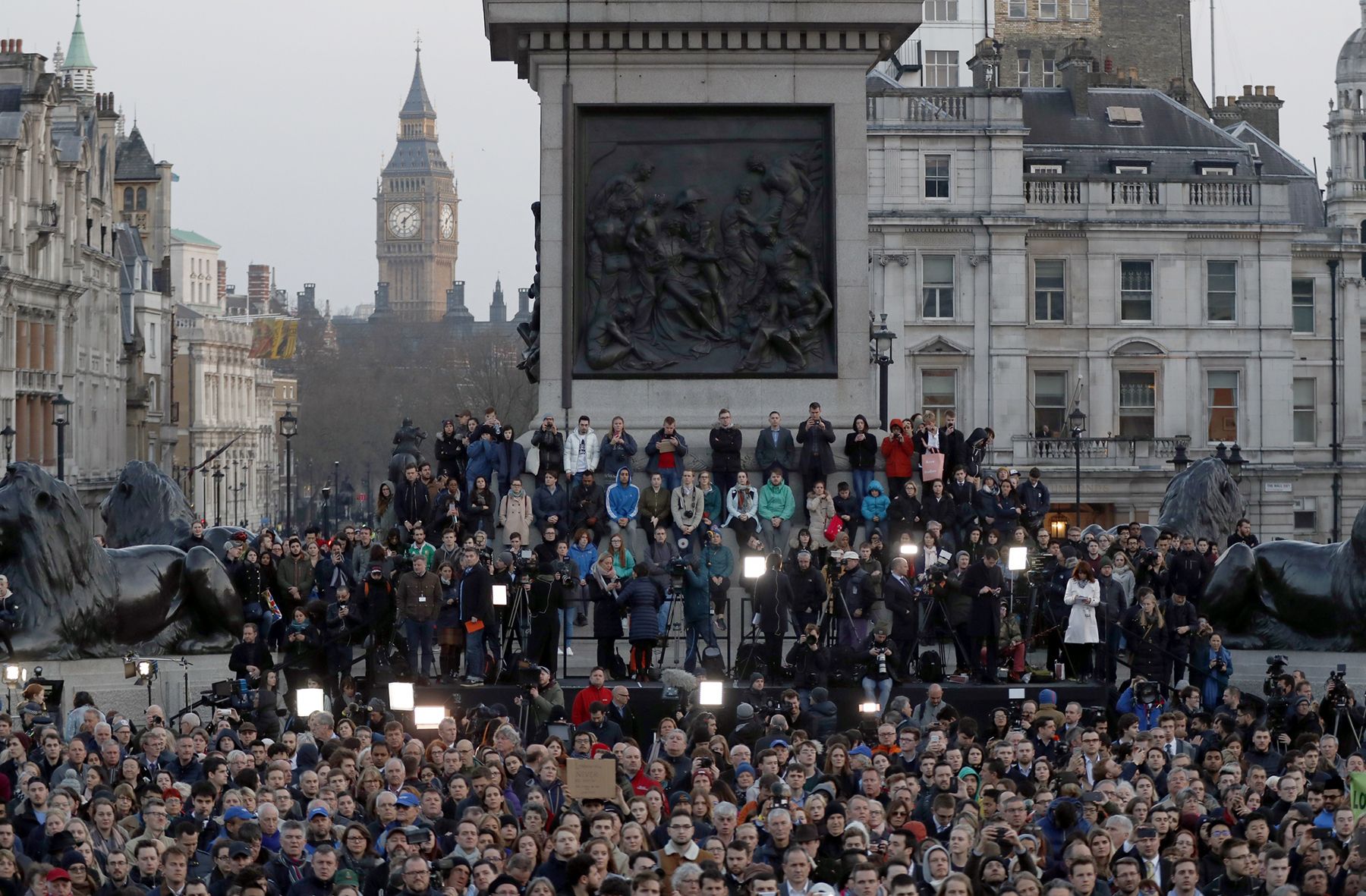 Фото: Stefan Wermuth / Reuters / Scanpix / LETA 23 марта несколько тысяч человек пришли на Трафальгарскую площадь в Лондоне, чтобы почтить память о жертвах теракта, который произошел накануне у здания парламента Великобритании; в результате нападения погибли три человека и около 30 пострадали. На акции выступили мэр Лондона Садик Хан и министр внутренних дел Великобритании Эмбер Радд.