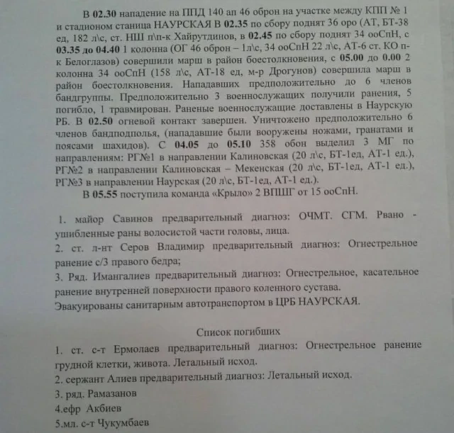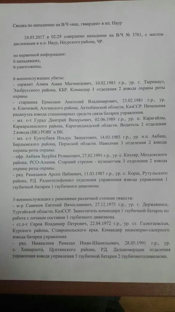 По официальной версии, подтвержденной пресс-службой Нацгвардии, в ночь с 23 на 24 марта шесть жителей станицы Наурская (личности установлены) атаковали в/ч 3761. В ходе «перестрелки» нападавшие были ликвидированы, шесть военнослужащих Нацгвардии убиты, трое получили ранения. Однако официальная версия о нападении на подразделение Нацгвардии, дислоцированное в станице Наурская, вызывает большие сомнения. В распоряжении «Новой газеты» оказались незаретушированные фотографии чеченцев, якобы погибших в ходе «боестолкновения». Эти фотографии сделаны на месте происшествия одним из членов следственно-оперативной группы. На фотографиях отчетливо видно, что все «нападавшие» убиты практически одним и тем же способом – выстрелом в голову.