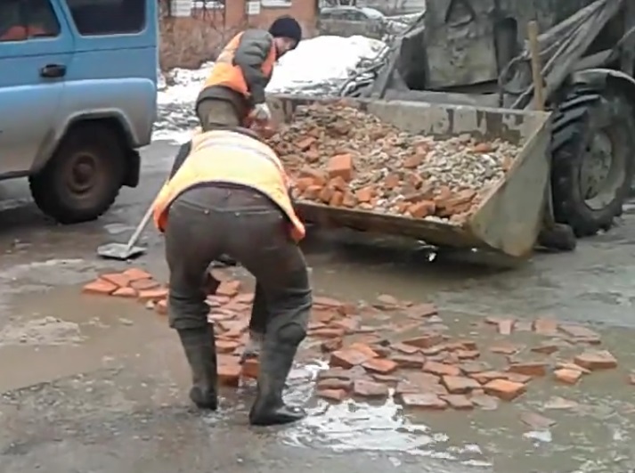 В то время когда неуклонно укрепляются экономическая и оборонная мощь нашей Родины, растет благополучие народа и личные достояния отдельных личностей в частности а также укрепляется чувство комфортной сытости каждого наше правительство взяло курс на возрождение исторических традиций. Несмотря, на попытки злопыхателей в своих публикациях - http://7x7-journal.ru/post/93189 ввести в заблуждение а также всякие рассказы прихвостней загнивающего запада о так называемой тотальной коррупции, и их попыток опорочить взятый верный курс правительства и партии, в нашей стране крепнет семимильными шагами возрождение исконной вековой традиции строительства дорожных покрытий - мощение дорог обожженным красным кирпичом вручную.