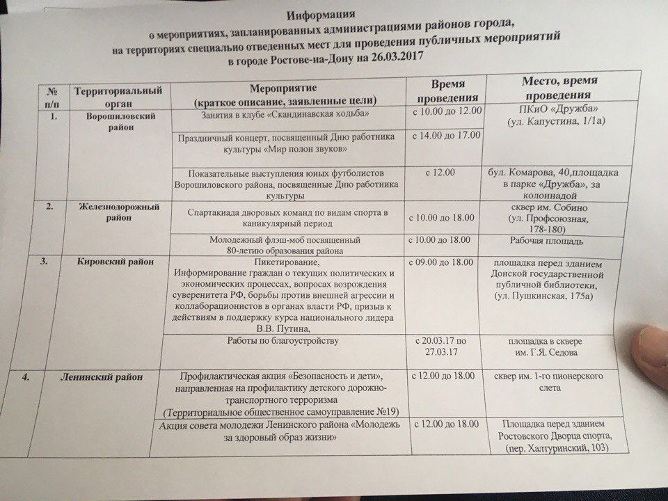 Администрация Ростова-на-Дону отказалась согласовывать протестный митинг под предлогом, что все 16 доступных площадок заняты разными мероприятиями. Ремонтными работами, спортивной ходьбой, концертами, молодежными флешмобами, показательными выступлениями и даже «профилактической акцией „Безопасность и дети“, направленной на профилактику детского дорожно-транспортного терроризма».