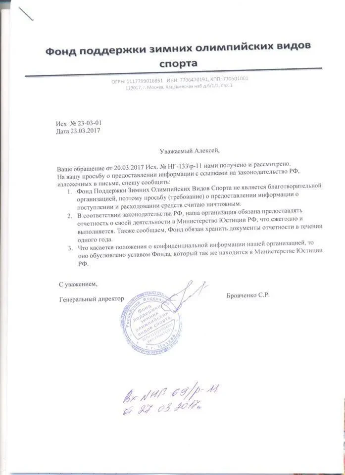 Фонд поддержки зимних олимпийских видов спорта прислал в редакцию ответ, что Фонд не является благотворительной организацией, поэтому наше требование предоставить информацию о доходах и расходах директор Сергей Бровченко считает «ничтожным».