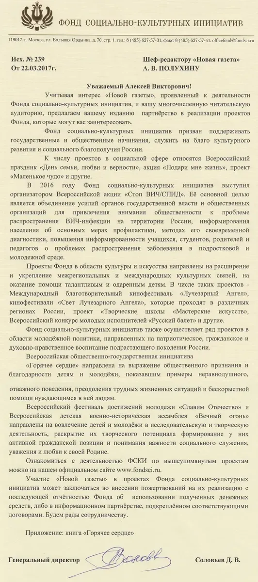 Запросы мы отправили 20 и 21 марта и ждем ответов. Пока мы получили только письма из ФСКИ, «Градиславы» и «Дара»: организации благодарят «Новую газету» за внимание к своей деятельности и мягко дают понять, что отчетов не предоставят. Например, так: