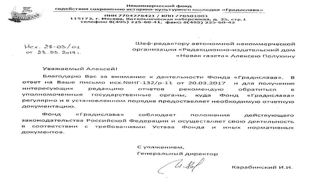 Фонд «Градислава» не очень открыт для общения с прессой. Телефон, указанный при регистрации, принадлежит лично генеральному директору Ивану Карабинскому. При разговоре с корреспондентом «Новой» он отказался дать электронный адрес или факс, заметив: «Я же не могу вас идентифицировать как журналиста», — и предложил принести запрос в офис.