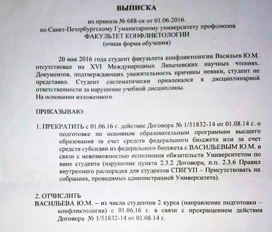 Васильева, в частности, отчислили с факультета конфликтологии за пропуск «Лихачевских чтений» по неуважительной причине.