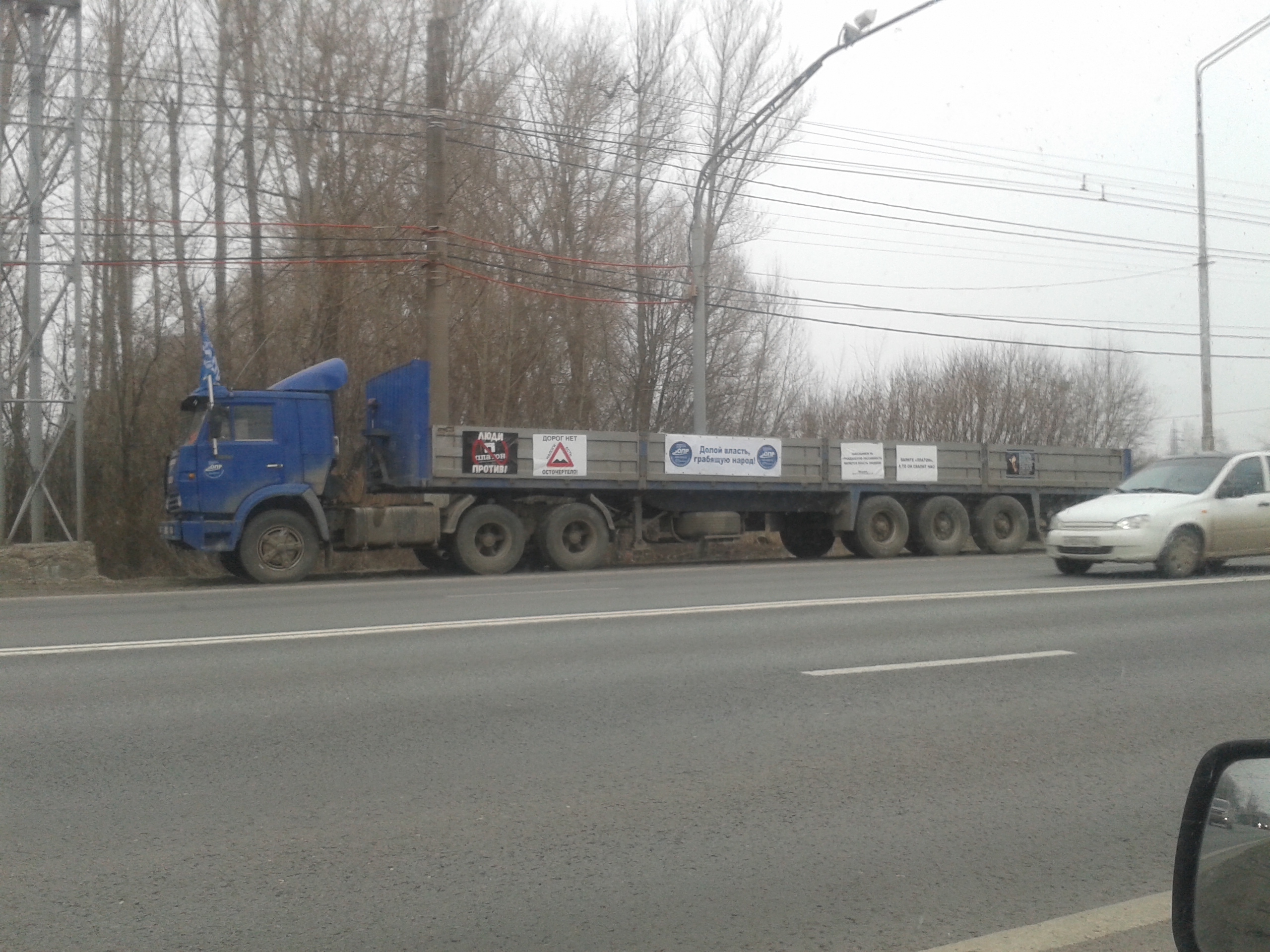 Друзья! Я не знаю деталей, почему рязанские дальнобойщики, в основном, разъехались. Может, их запугали, может, власть что-то посулила. Но одна машина - Леши Борисова - стоит, я ее вчера видел. Поддержим Алексея! И один в поле воин! А еще завтра, 2-го апреля, я иду на прогулку свободных людей. Эти прогулки идут уже несколько месяцев каждые выходные. Завтрашняя будет посвящена, в том числе, поддержке дальнобойщиков. А также требованиям ответа на вопросы о коррупции Медведева, поставленные Навальным, и освобождения политзаключенных.