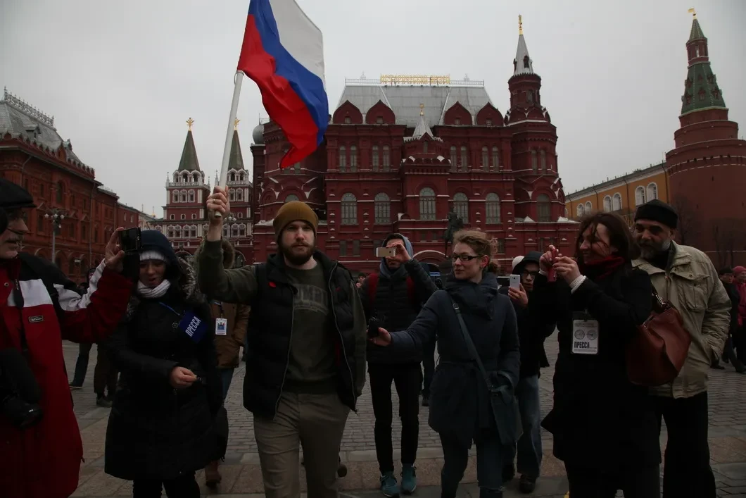 На Манежке внезапно появляется мужчина с российским флагом. Это такой же молодой человек, он так же прогуливался перед Красной площадью, просто в какой-то момент развернул и поднял вверх флаг. Журналисты, уставшие ждать хотя бы намека на протест, с разных сторон бросаются к нему. Обступают с микрофонами, камерами, диктофонами.