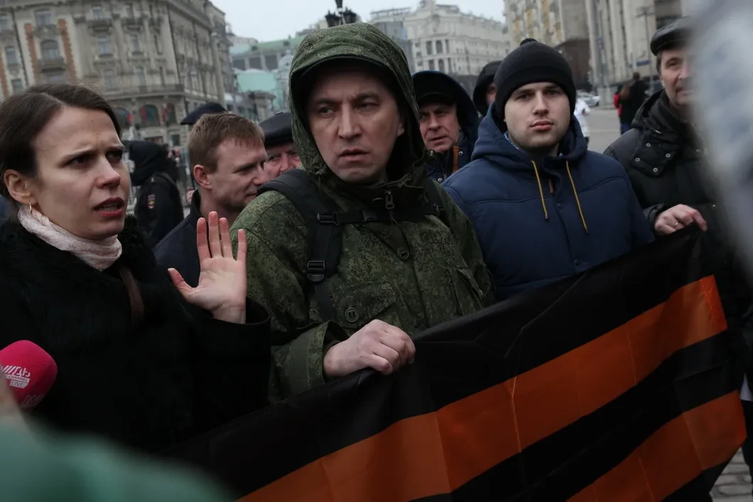 На Манежной появляется движение SERB. Мужчины - в шарфах цвета георгиевской ленты, женщины – с ленточками на сумках. Они стоят кучкой, улыбаются журналистам и поддерживают с ними разговор.