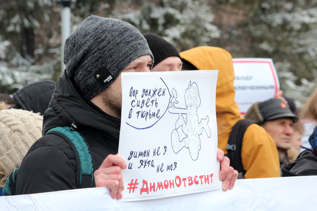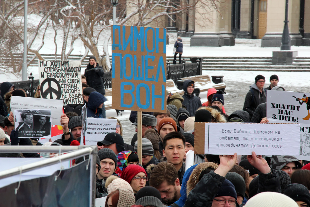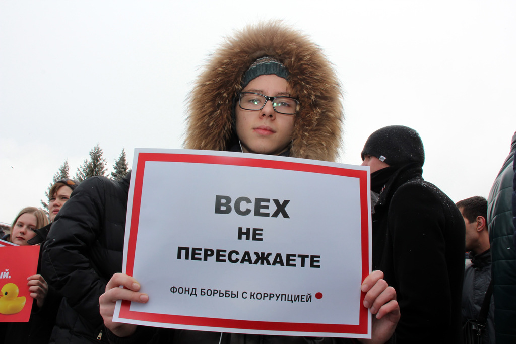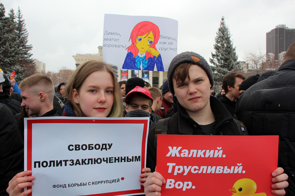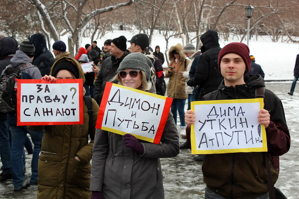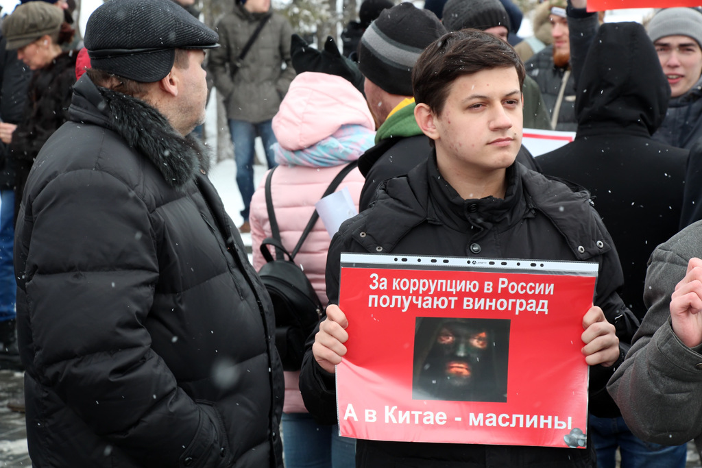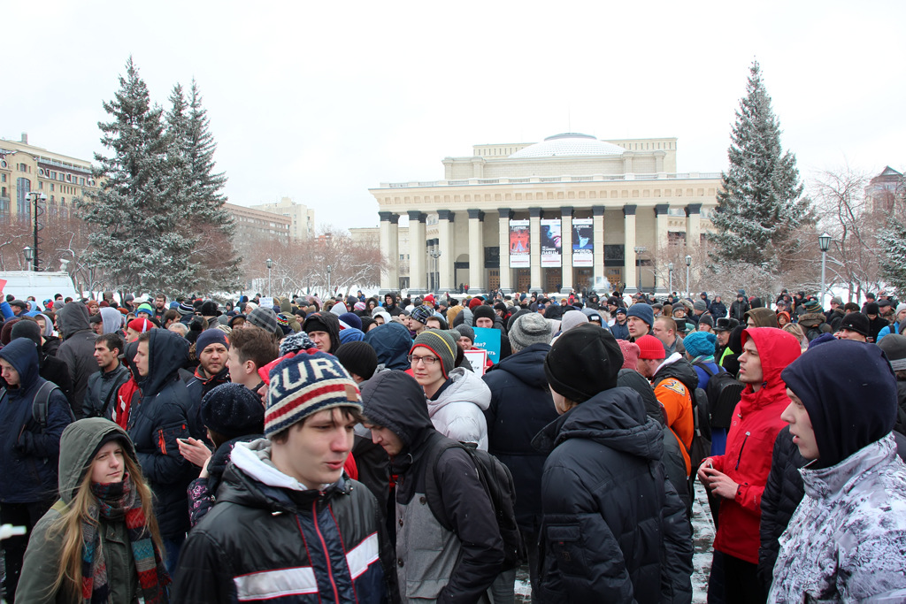 На усыпанном снегом постаменте памятника Ленину кто-то из участников вывел «20!8» — символ президентской кампании Алексея Навального. При этом далеко не все пришедшие молодые люди оказались его сторонниками — больше говорили о нетерпимости к коррупции, произволу власти и правоохранительных органов.