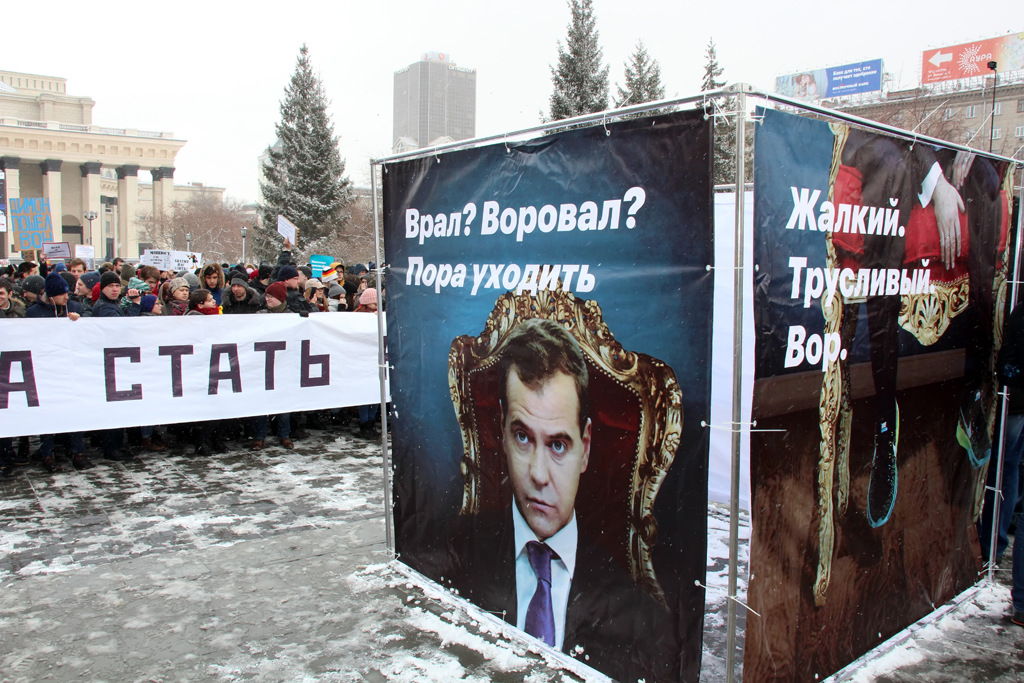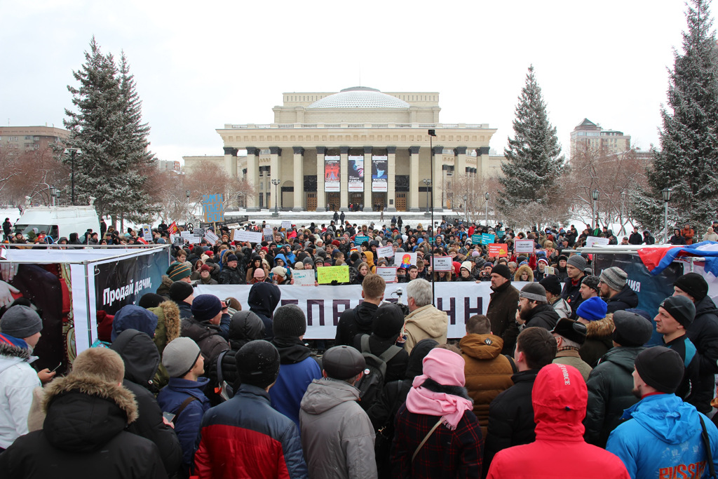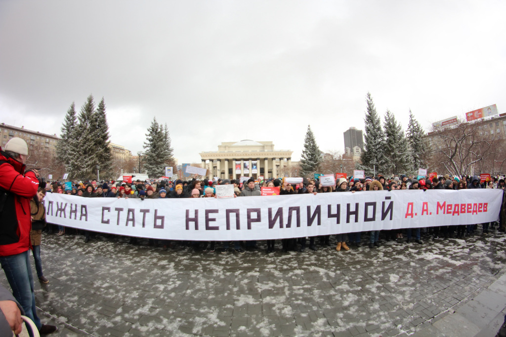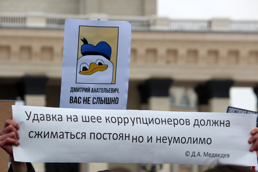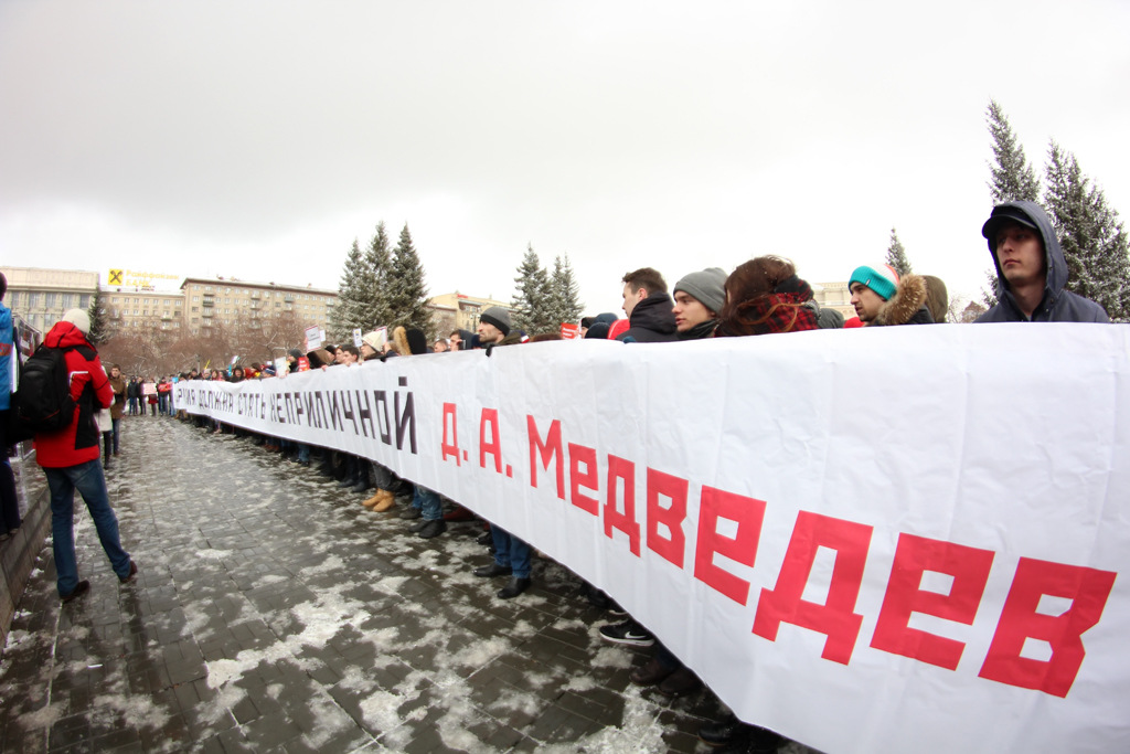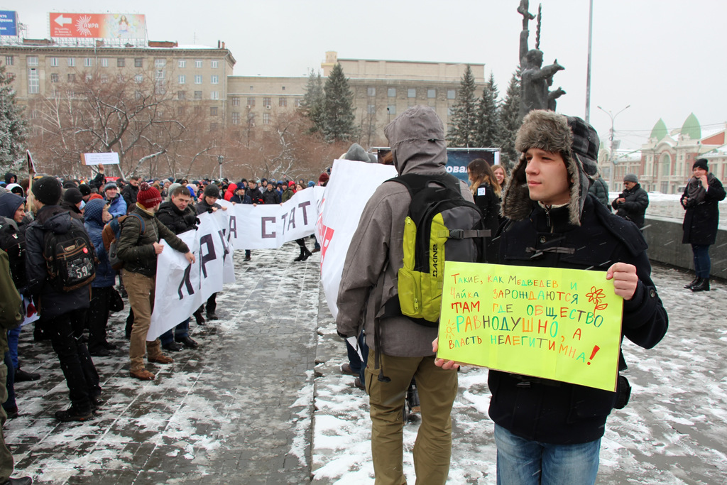 Около 500 новосибирцев вышли на пикет против коррупции. Они потребовали освободить всех задержанных на протестных акциях 26 марта и напомнили премьер-министру Дмитрию Медведеву его же слова о коррупции.