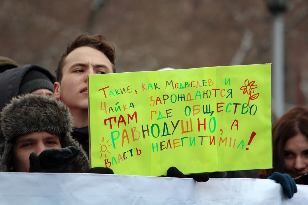 Главный транспарант акции растянулся метров на двадцать. На нем значилась цитата Медведева: «Коррупция должна стать неприличной». Многие участники пришли с плакатами «Свободу узникам совести».