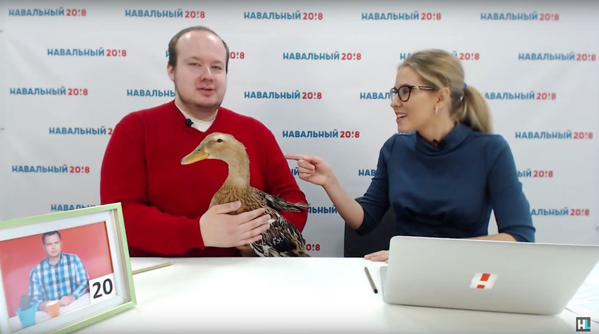 «Я не лохматая? Может, мне поправить?» — спрашивает Соболь, кажется, режиссера. Она сидит за столом на фоне с надписью «НАВАЛЬНЫЙ20!8». На столе — ноутбук, резиновая уточка и портрет Николая Ляскина, постоянного соведущего Соболь. Ляскина задержали на акции в Москве 26 марта — суд признал его виновным в «повторном нарушении порядка организации митинга» и заключил под стражу на 25 суток.