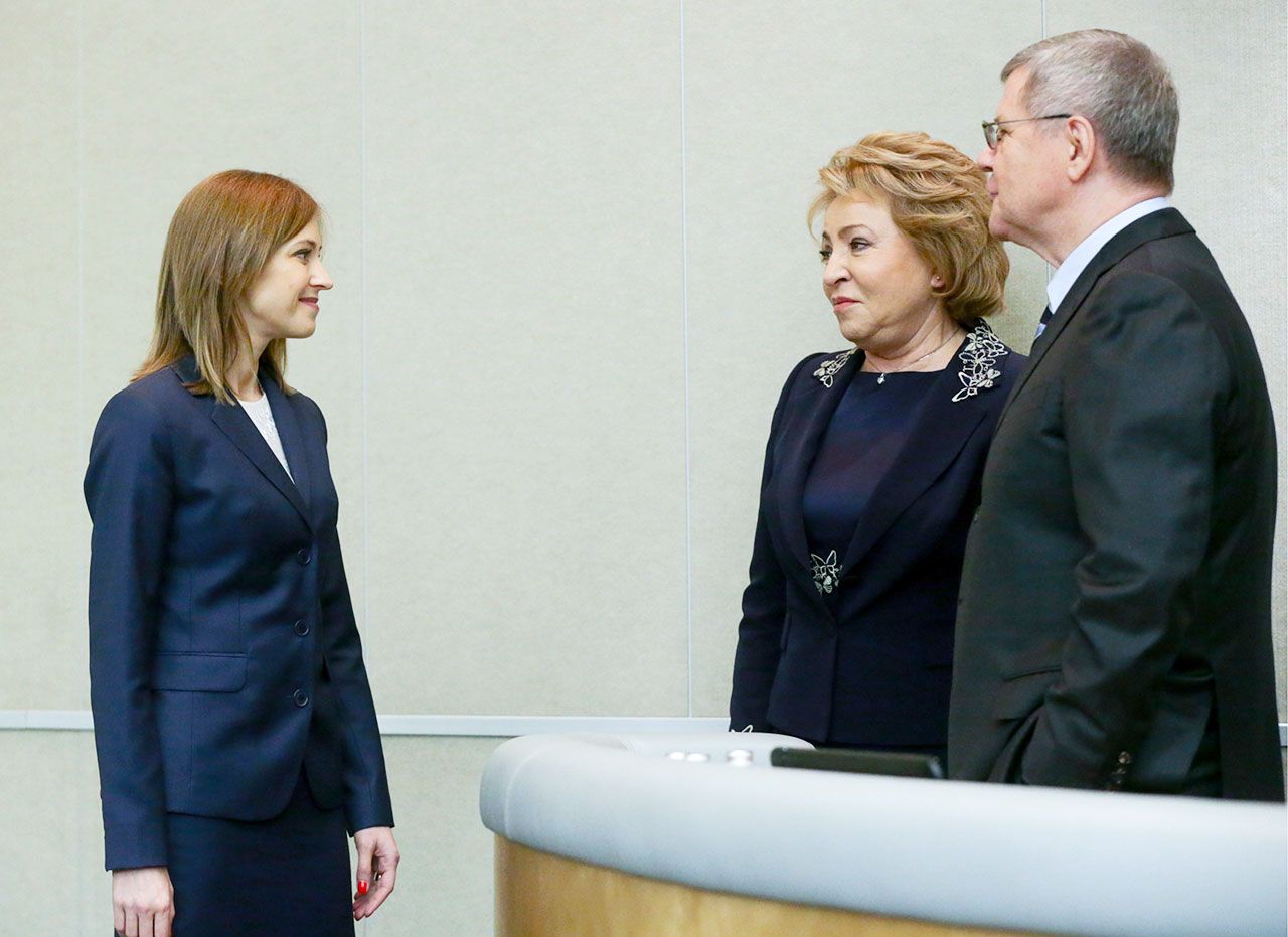 «Скажу без лишней скромности, что русский Крым и Севастополь, вся необъятная, огромная Россия, все мы чувствуем такую гордость за нашего президента, которой завидуют в других странах, — немного нервно, часто подглядывая в бумажку, говорила женщина в белом пиджаке, стоя на трибуне Государственной думы 18 марта 2017 года, ровно три года спустя после подписания договора о принятии Республики Крым в состав России. — Настанет время, и даже самые оголтелые критики будут вынуждены признать: Крым и Севастополь — это Россия. Вместе, безальтернативно и навсегда».