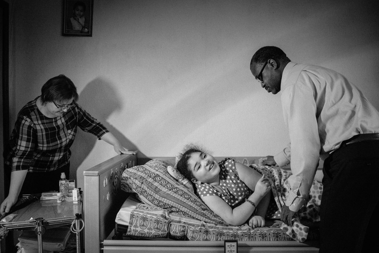 Мама Наталья — по образованию ветеринар, после рождения Наоми так и не успела поработать по профессии. Она находится все время дома, рядом с дочерью. Папа Касси работает шоферомФото: Стоян Васев для ТД Когда Наоми слегла, чтобы отвезти ее на комиссию, семья искала через знакомых минивэн, раскладывала сиденья, тяжелую, обмякшую девочку переносили друзья и знакомые. Так же и во время госпитализаций — чтобы вынести человека на носилках, санитару нужна помощь. Мать бегает по соседям, ищет дворников, вызванивает отца или друзей. Панический, тяжелый круг действий, знакомый каждому, у кого тяжело болели близкие.