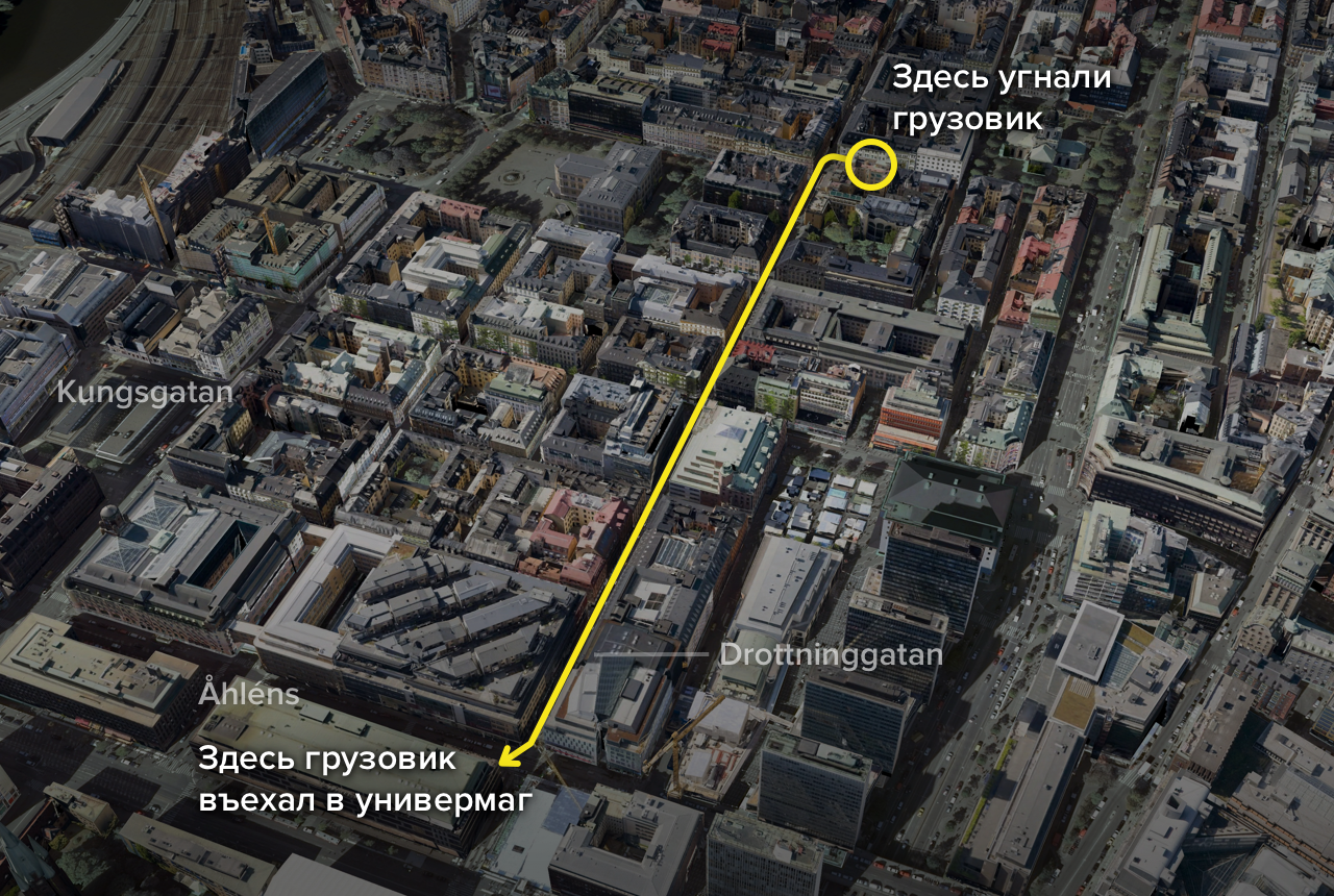 Нападение произошло в самом центре Стокгольма. Грузовик врезался в прохожих на пешеходной улице Дротнинггатан, а затем протаранил витрину универмага Åhlens. По заявлению шведских властей, погибли два человека, хотя СМИ сообщают о трех и даже о пяти погибших. Не менее восьми человек пострадали. Сообщалось также, что поблизости были слышны выстрелы, но эти данные не подтвердились.