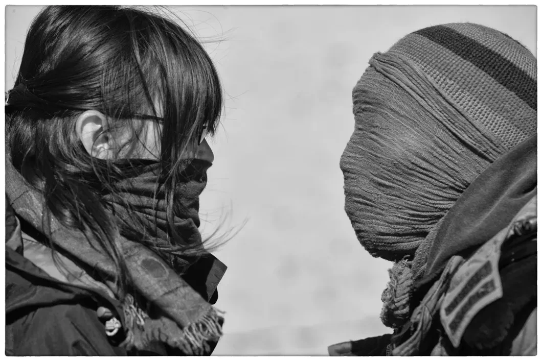 Внутренняя Монголия, Китай, 2005-ый год, съемки фильма «Монгол» Сергея Бодрова-старшего. Природа там разнообразная – есть и березовые рощи, и холмы. Но если отъехать от них, начинается пустыня с настолько мелким песком, что сложно, не то что ходить – разговаривать. Участники съемочной группы ходили постоянно в слезах, заматывались почти полностью. Это не постановочная фотография – на ней режиссер Гука Омарова и казахский кинематографист Нарын Игилик обсуждают рабочие вопросы.