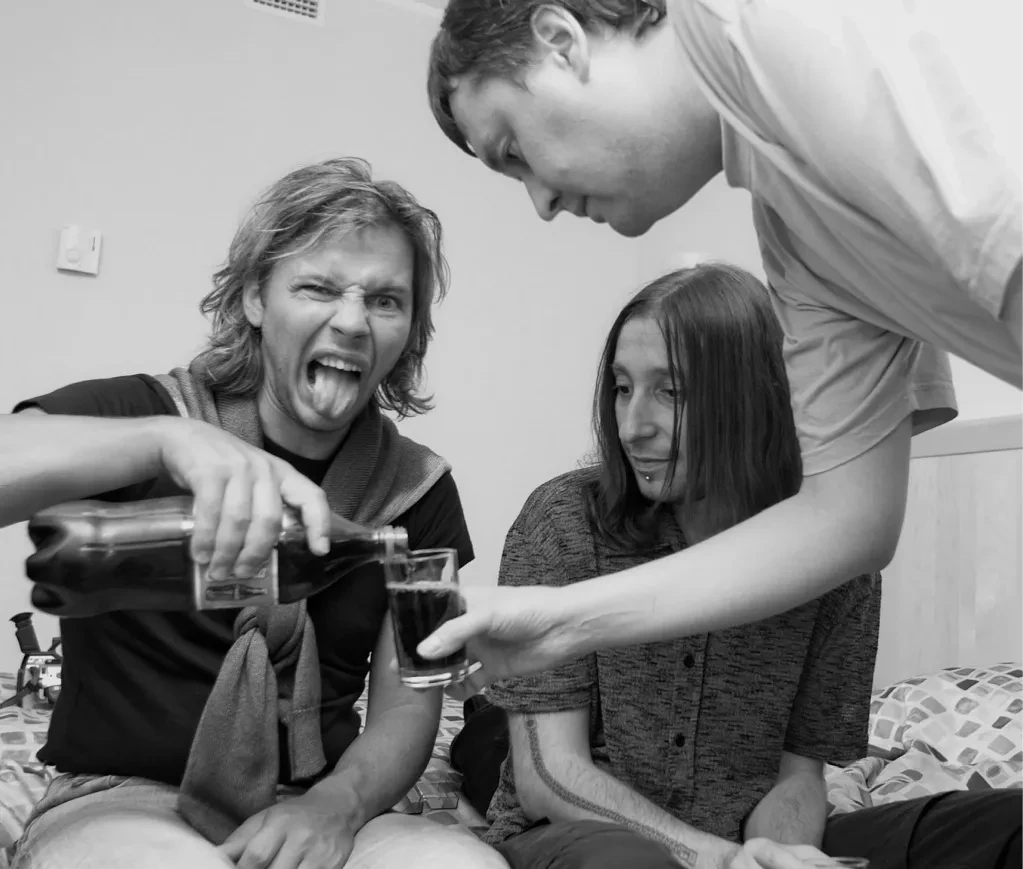 Мы познакомились с Би-2, когда они только приехали из Австралии. Снимали квартирку в районе Проспекта 60-летия Октября, я часто бывал у них. На фотографии – номер гостиницы в Риге, куда мы в начале нулевых прилетели снимать клип «Моя любовь». Там был такой фактурный целлюлозно-бумажный комбинат, где раньше на всю Россию делали перфокарты и бумаги для регистраторов. Как только мы поселились, сразу же прибежал Лагутенко. Было весело, пить мы начали еще в аэропорту, продолжили в самолете – отсюда и странный взгляд Шуры на Илью, который, по-моему, вообще не употребляет алкоголь.