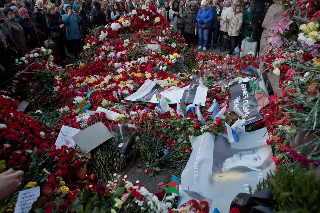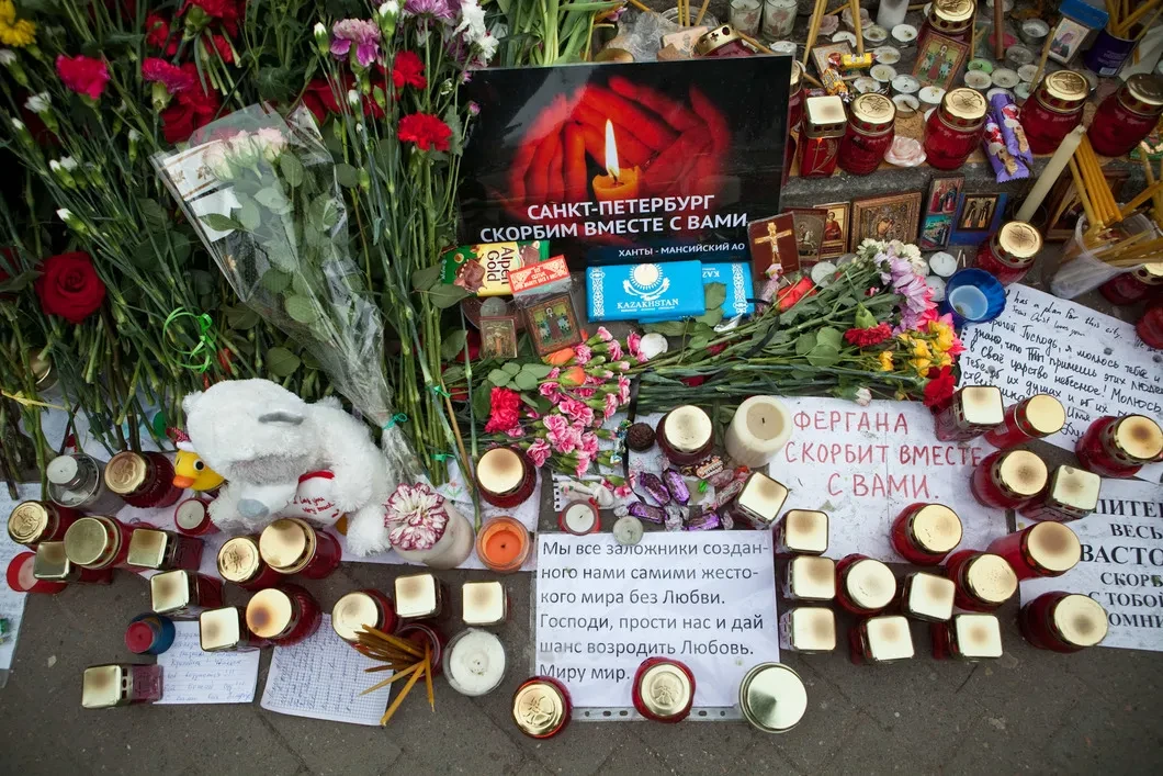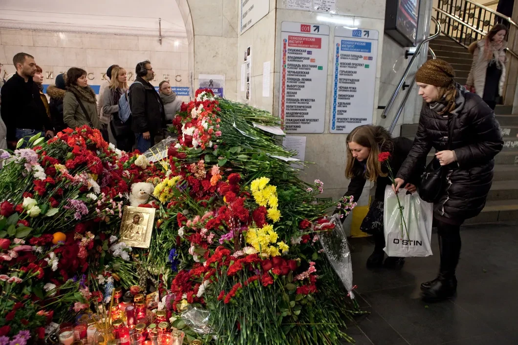 Мемориал у станции «Технологический институт» в Петербурге, где 3 апреля произошел теракт: смертник взорвался в вагоне метро. Погибли 14 человек, еще около 50 пострадали. Второе взрывное устройство, в несколько раз большей мощности, спецслужбам удалось обнаружить и вовремя обезвредить на станции метро «Площадь Восстания».