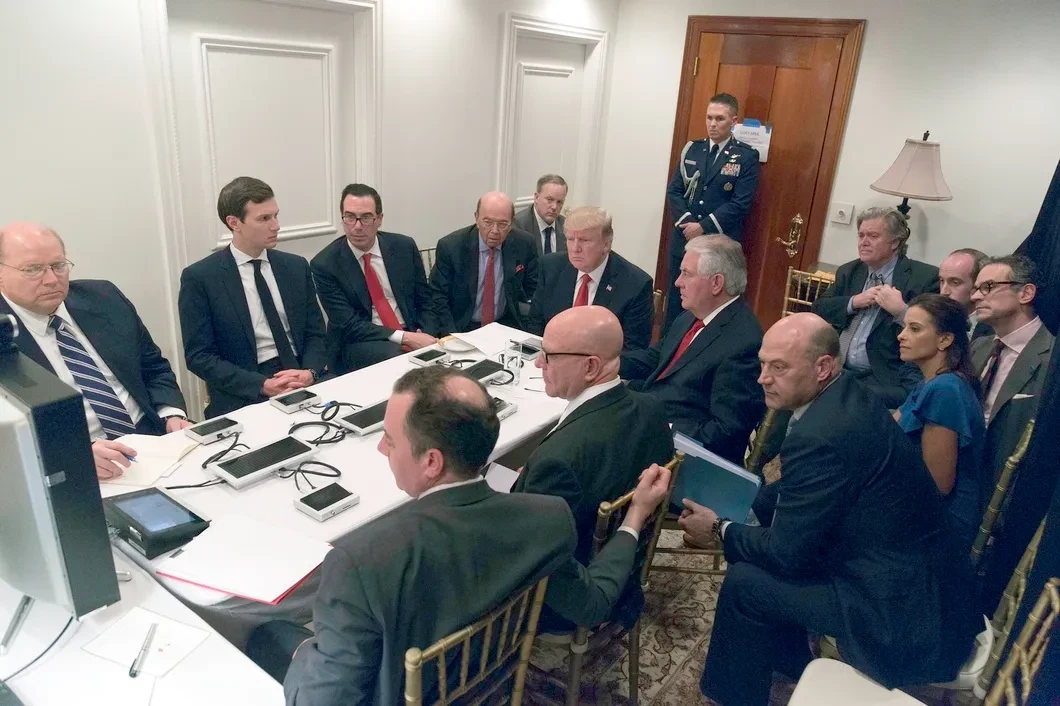 Пресс-секретарь Белого дома Шон Спайсер опубликовал фотографию, сделанную во время брифинга для президента Трампа и руководства администрации США по поводу только что нанесенного американцами ракетного удара по объектам в Сирии. На фото — реакция на последствия удара американских ракет «Томагавк» по сирийским целям. Рядом с Дональдом Трампом госсекретарь Рекс Тиллерсон.