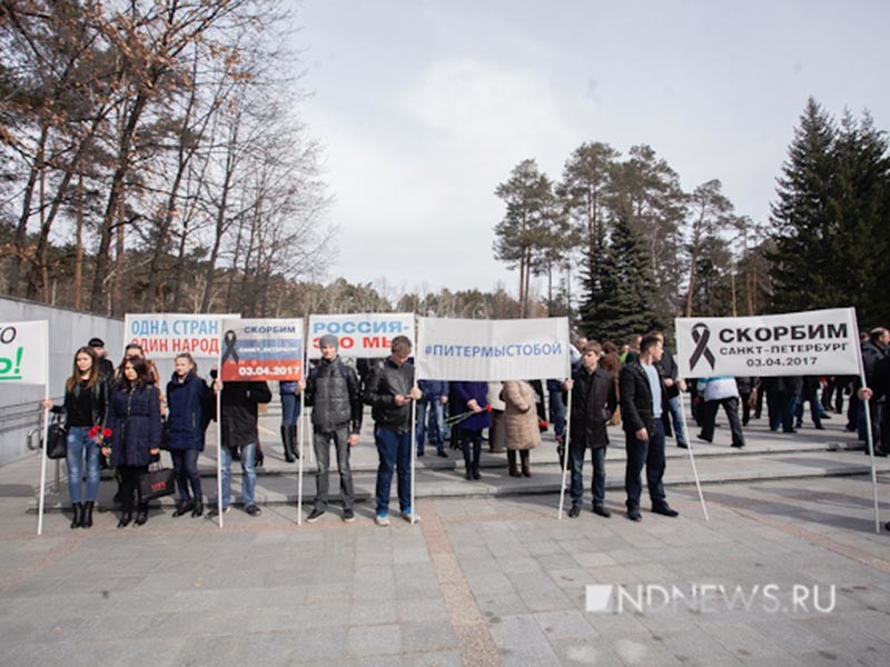 Плакат "Одна страна, один народ" держали в руках молодые люди. Среди других лозунгов: "Питер, мы с тобой", "Просто жить!", "Россия - это мы" и "Скорбим, Санкт-Петербург 03.04.2017".