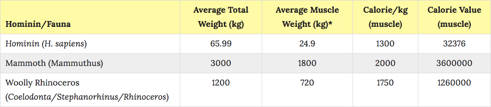 Коул затем изучил, сколько калорий содержится в мышечной ткани животных, которых ели неандертальцы. Выяснилось, что, если съесть все мышцы мамонта, можно получить 3,6 миллиона калорий. Из шерстистого носорога — 1,3 миллиона калорий.