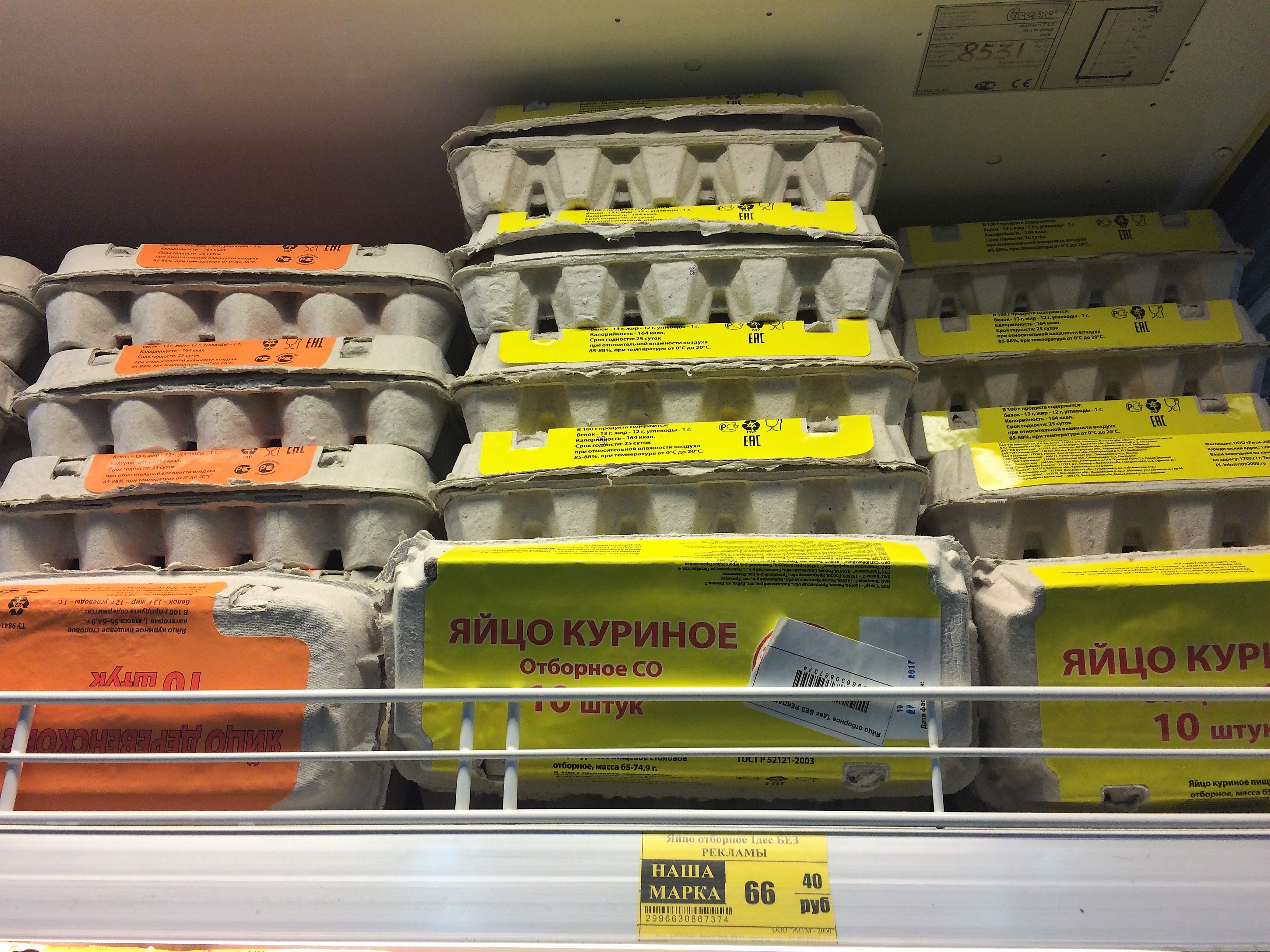 Цены на куриные яйца, увиденные корреспондентами Радио Свобода, продолжают оставаться наиболее нестабильными. В Москве, например, стоимость десятка в категории "отборные" с начала года к февралю снизилась более чем на 15 процентов со 115 до 88 рублей, но к началу марта опять выросла – до 97 рублей. Апрель добавил неопределенности: корреспонденту Радио Свобода удалось найти яйца той же категории по цене в 69 рублей за десяток (это на 42 с половиной процента дешевле, чем месяц назад, и почти на 53 процента – чем в начале года). В Пскове наблюдались схожие тенденции: за первый месяц года яйца подешевели с 64 до примерно 55 с половиной рублей (минус 13,4 процента), но к началу марта они резко подорожали – почти до 69 с половиной рублей за десяток. В апреле цены скорректировались – до чуть менее 66 с половиной рублей (минус 4,5 процента за месяц).