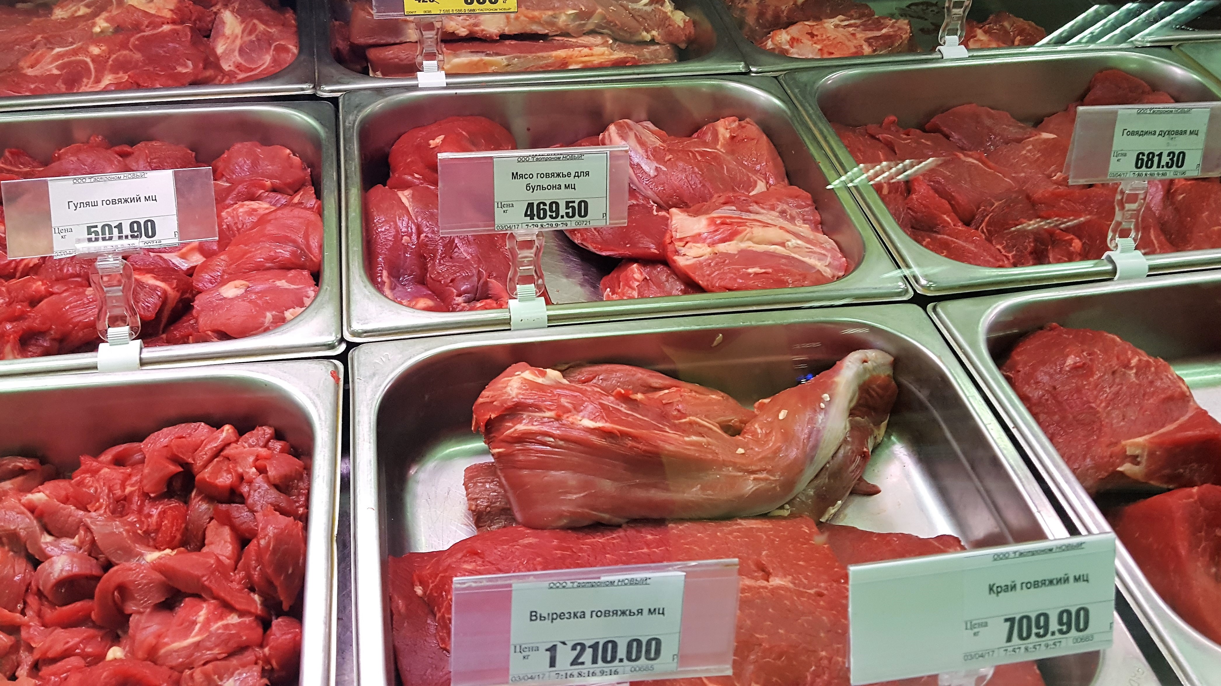 К началу апреля цены на охлажденную говядину, ассортимент которой в России достаточно разнообразен, по сравнению с началом года практически не изменились и показывают образец стабильности. В Москве в сети универсамов "Алые паруса", например, килограмм самого дешевого мяса (говядина для бульона) по-прежнему стоит чуть менее 470 рублей. Примерно такая же ситуация и в Пскове: за январь минимальная цена килограмма говядины выросла сразу на 5,5 процента – с 360 до 380 рублей, но затем она вновь снизилась до прежнего уровня к началу марта. В апреле цены также не изменились.