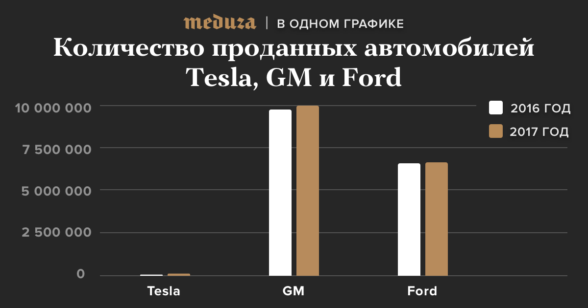 По сравнению с крупнейшими американскими производителями — General Motors и Ford, которые существуют десятки лет, — Tesla продает мало машин. Если сравнить количество проданных автомобилей, то Tesla даже не будет видно на графике.