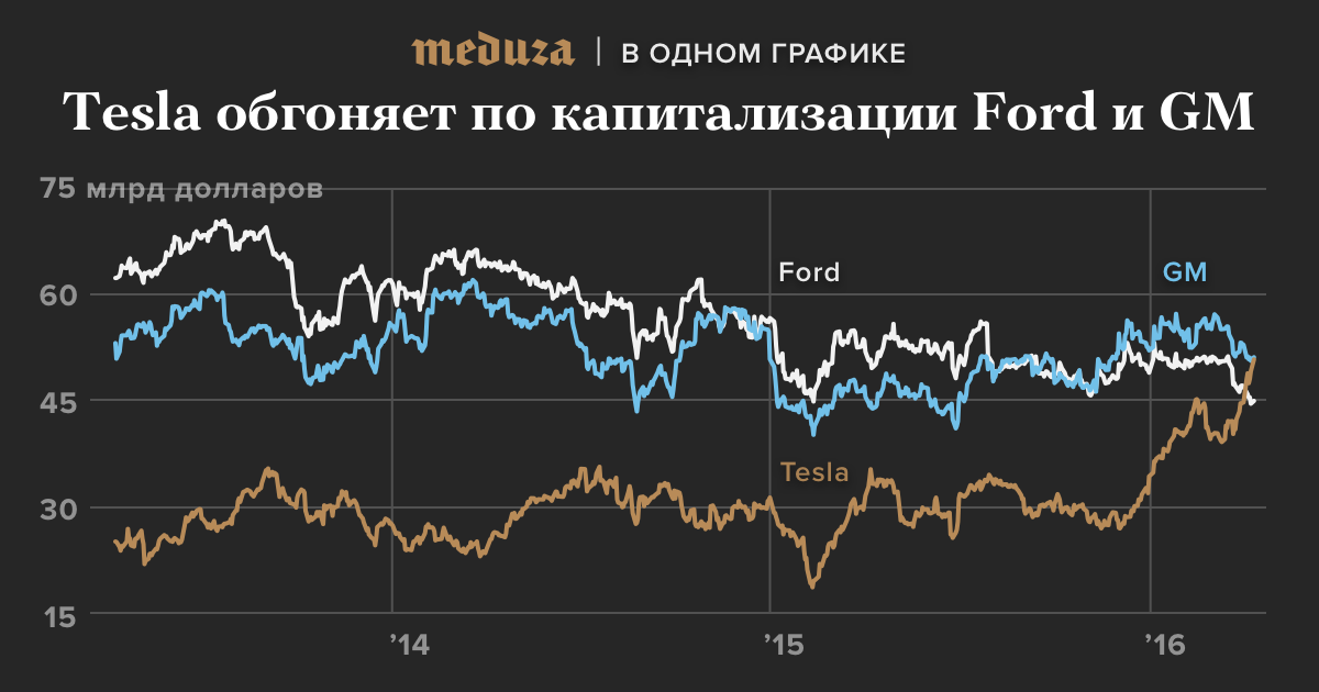 Сейчас Tesla снова стоит чуть дешевле GM, но все еще дороже Ford. Tesla оценивается в 49,96 миллиарда долларов, GM — в 50,91 миллиарда, Ford стоит 44,75 миллиарда долларов.