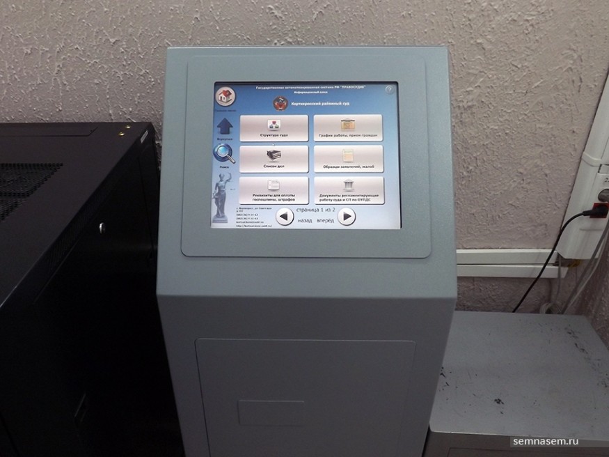 Возле дверей в коридор суда обнаружили интерактивный справочный терминал. Здесь он работает, что случается не в каждом из судов. Посмотрев список заседаний, на которые можно попасть, общественники разошлись по коридорам, рассматривая правила поведения в здании суда. Игоря Сажина особенно заинтересовал стенд с историей Корткеросского районного суда. На стенах висят картины, написанные бывшим председателем суда Лидией Мельник.