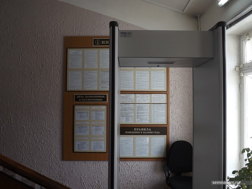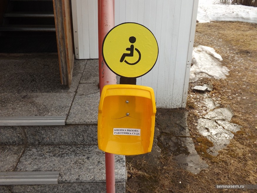 Первое нарушение было обнаружено уже у входа в здание районного суда. Справа от крыльца красовалась надпись для инвалидов «кнопка для вызова работников суда». Самой кнопки не было, как не было и пандуса. За узким входом виднелась довольно крутая лестница, над которой возвышалась рамка металлоискателя. За ней маячил пристав, за его спиной висела доска информации.