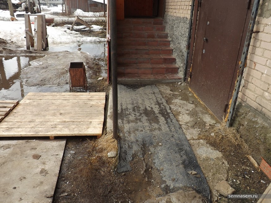 Найти место, где заседают мировые судьи, оказалось делом нелегким, хотя оно и находится рядом с районной администрацией. Наблюдатели узнали от продавщицы, что вход расположен с обратной стороны здания местного торгового центра. Там действительно обнаружилось крыльцо, не оборудованное пандусом или каким-то другим приспособлением, которое позволило бы попасть к судье человеку с ограниченными физическими возможностями. Однако и здоровым людям трудно подобраться к крыльцу из-за луж и из-за того, что рядом припаркован грузовик, из которого в магазин отгружают свежий хлеб.