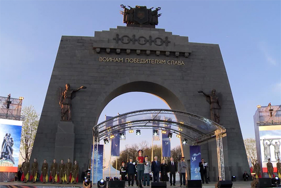 © Piter.TV Церемония открытия Арки Победы в Красном Селе. 9 мая 2015 года На выставке есть проект трибун на площади Урицкого — не слишком тщательный, возникший по бытовой необходимости. Почти сразу после революции власть взялась регламентировать порядок демонстраций (что-то знакомое). Площадь у кроваво-красного Эрмитажа оставалась центральной, и барочные подъезды дворца декорировали трибунами-ширмами с массивными гербами СССР. Предполагалось, что, когда колонна демонстрантов распределяется по трибунам, наступает кульминация действа. За счет трибун дворец казался ниже, а площадь походила на театр. Сейчас на время массовых мероприятий Эрмитаж просто отгораживают легким забором-сеткой. Без всякого театрализованного восприятия, проектирования и режиссуры — а ведь методы были хороши.