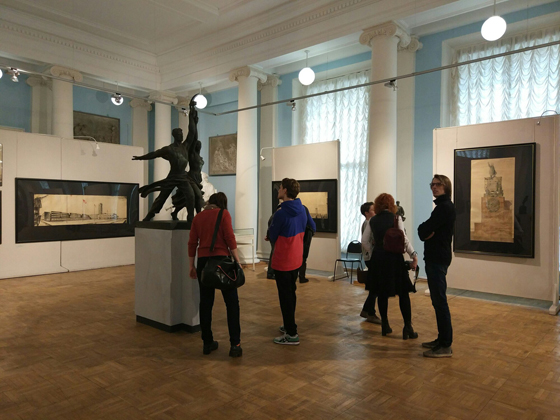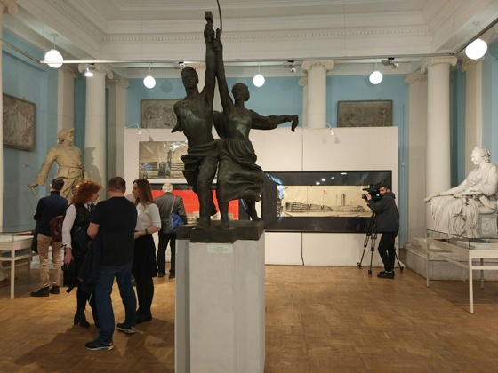Выставка «Монумент. Пропаганда» открылась в Голубом зале музея Академии художеств. И вроде бы камерный зал с небесно-голубой штукатуркой, доброй мраморной Екатериной II в углу и слегка потемневшим гипсовым Петром Великим не располагает к ностальгии по советской пропаганде. Но мотив 1917 года, зазвучавший в Петербурге после возвращения «Авроры» с ремонта, бодрым маршем прошелся по тихому музею, явив на свет то, что раньше видели только хранители. У нас на виду — «кухня» монументализма, жадно осваивающего революционный материал.