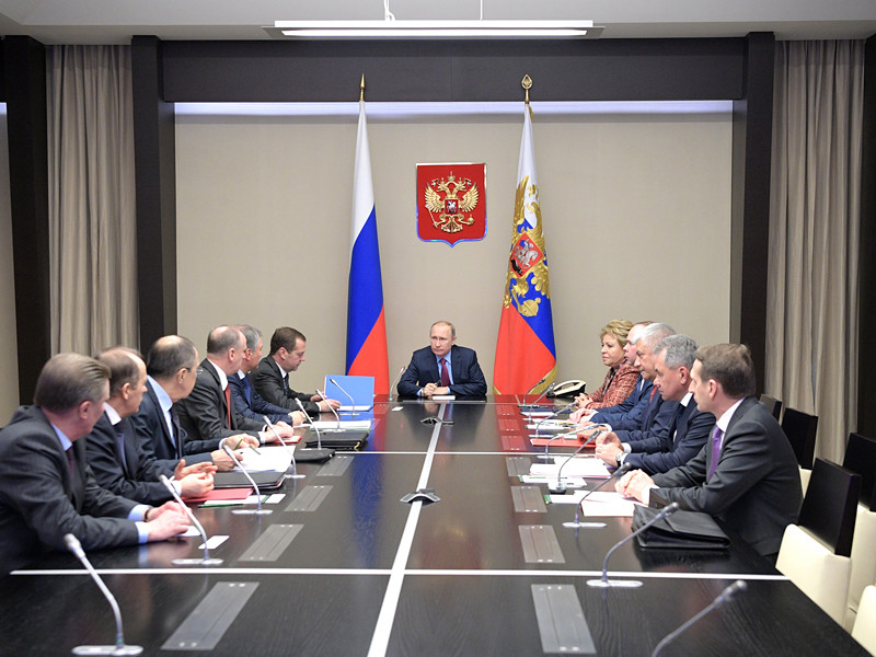 В совещании приняли участие премьер-министр Дмитрий Медведев, председатель Совета Федерации Валентина Матвиенко, председатель Госдумы Вячеслав Володин, руководитель администрации президента Антон Вайно, секретарь Совбеза Николай Патрушев, глава МИДа Сергей Лавров, министр обороны Сергей Шойгу, глава МВД Владимир Колокольцев, директор ФСБ Александр Бортников, директор СВР Сергей Нарышкин и спецпредставитель президента по вопросам природоохранной деятельности, экологии и транспорта Сергей Иванов.