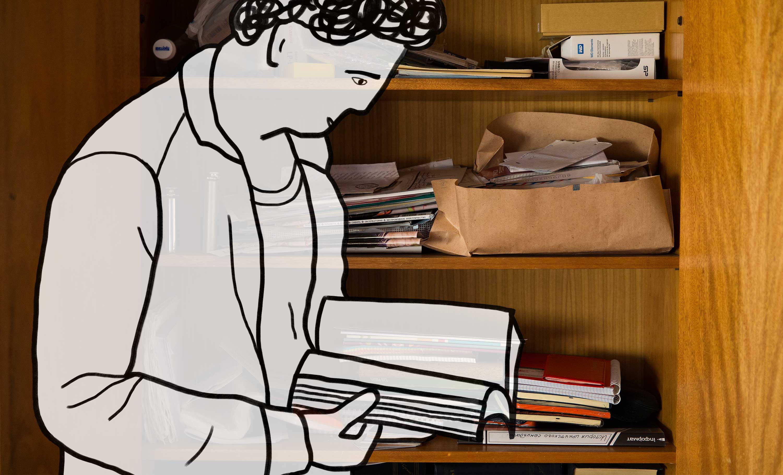 8:20. Дошли до полок с журналами, бумагами и книгами.