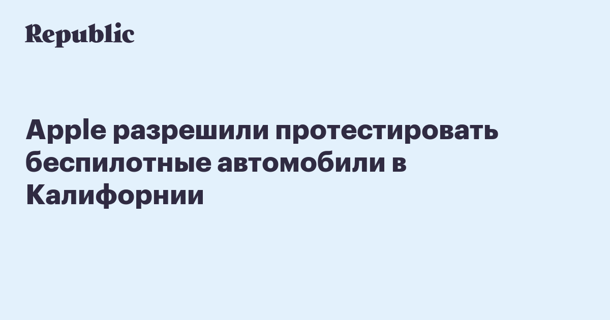 Корпорации Apple разрешили проводить испытания беспилотных автомобилей в Калифорнии. Об этом сообщается на сайте Департамента транспортных средств штата (DMV).