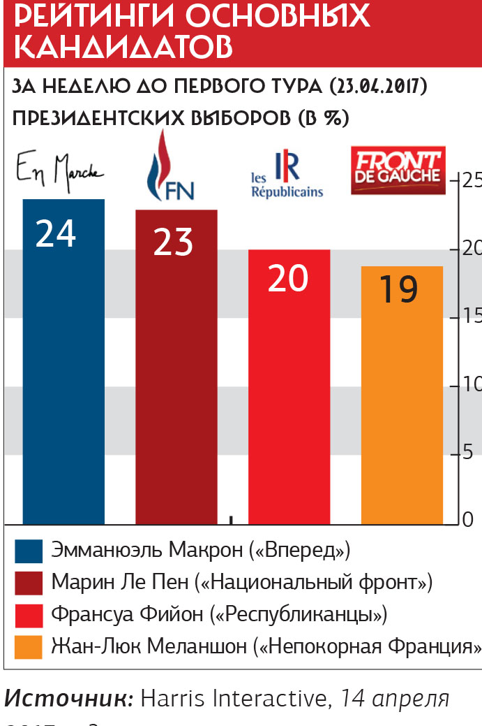 В конце января 2017 года рейтинг Жана-Люка Меланшона, лидера крайне левого движения «Непокорная Франция», не превышал 10%, и он сильно отставал от находившегося на четвертом месте социалиста Бенуа Амона. Сейчас ситуация резко изменилась. По данным опроса, проведенного 11 апреля Французским институтом изучения общественного мнения (IFOP), за лидера крайне левых были готовы голосовать 18,5% французов — всего за неделю Меланшон сумел набрать 3,5 процентных пункта, вплотную приблизившись к занимающему третье место Фийону (19%). Центрист Эмманюэль Макрон, напротив, потерял за последнюю неделю три процентных пункта — за него проголосовали бы 23% избирателей. Немного растеряла своих избирателей и глава «Нацфронта» Марин Ле Пен, но тем не менее она оставалась на первом месте в опросах (24%). Впрочем, настроения избирателей настолько волатильны, что опрос, проведенный всего три дня спустя, 14 апреля, зафиксировал уже иной расклад: Макрон выбился в лидеры, опередив Ле Пен на 1 процентный пункт — 24% против 23%.