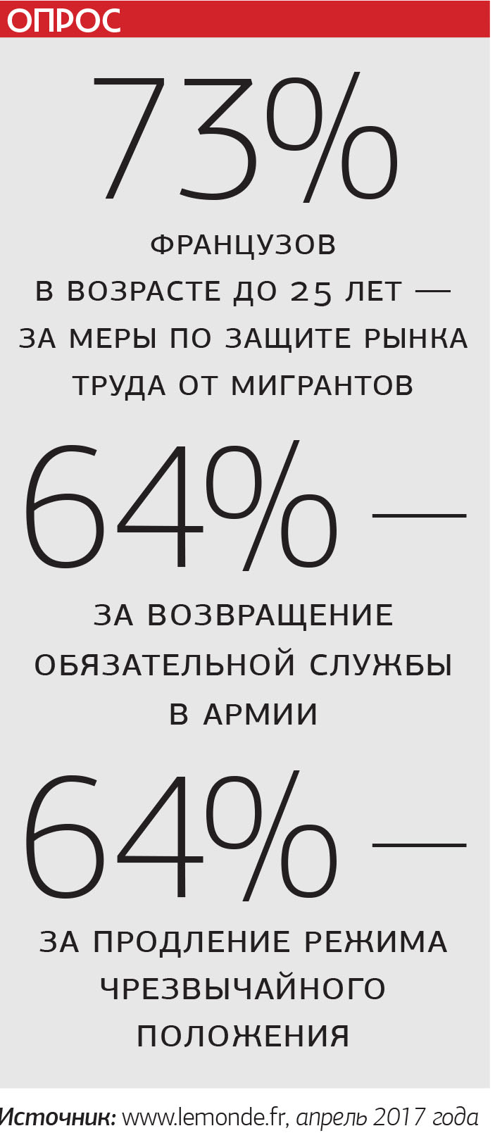 Зато 73% избирателей в возрасте до 25 лет одобряют предложенные Марин Ле Пен меры по защите французского рынка труда от мигрантов из стран с дешевой рабочей силой. 64% (!) молодых французов положительно отзываются об обещании Эмманюэля Макрона вернуть всеобщую обязательную службу в армии. Столько же молодых избирателей считают необходимым продлить в стране режим чрезвычайного положения. «Основная потребность сегодняшней французской молодежи — это потребность в защите», — объясняет на страницах Le Monde социолог Матье Кан.