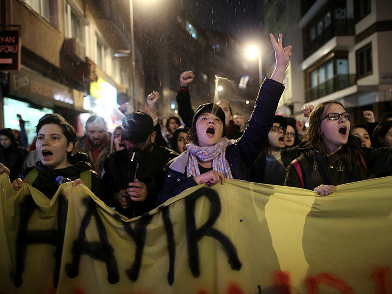 Тысячи противников поправок к конституции Турции, расширяющих полномочия президента Реджепа Тайипа Эрдогана, которые по предварительным итогам референдума будут закреплены в основном законе страны, вышли на улицы Стамбула, сообщает Yahoo News.