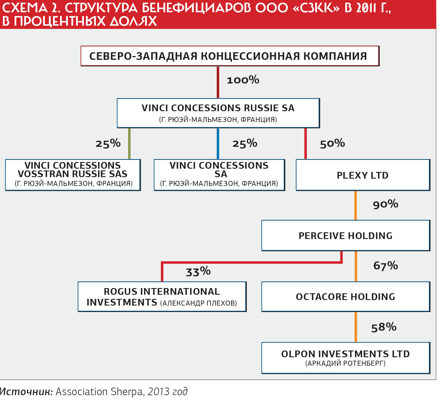 В 2011 году структура владельцев СЗКК поменялась (см. схему 2). Sherpa не удалось установить всех бенефициаров, но Аркадий Ротенберг в их числе остался. При этом в компанию концессионеров влился его земляк — питерский бизнесмен Александр Плехов, в начале 2000-х — партнер по бизнесу Олега Малинина, зампреда банка «Россия», принадлежащего братьям Ковальчукам.