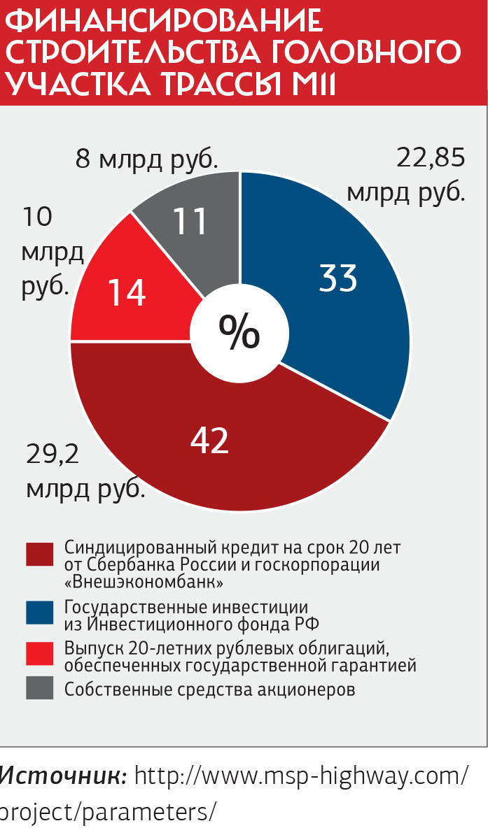 По данным сайта платной дороги www.msp-highway.com, из общей суммы затрат на само строительство ушли две трети — 44 млрд руб. (67%), остальное — на обслуживание кредитной линии и уплату НДС.