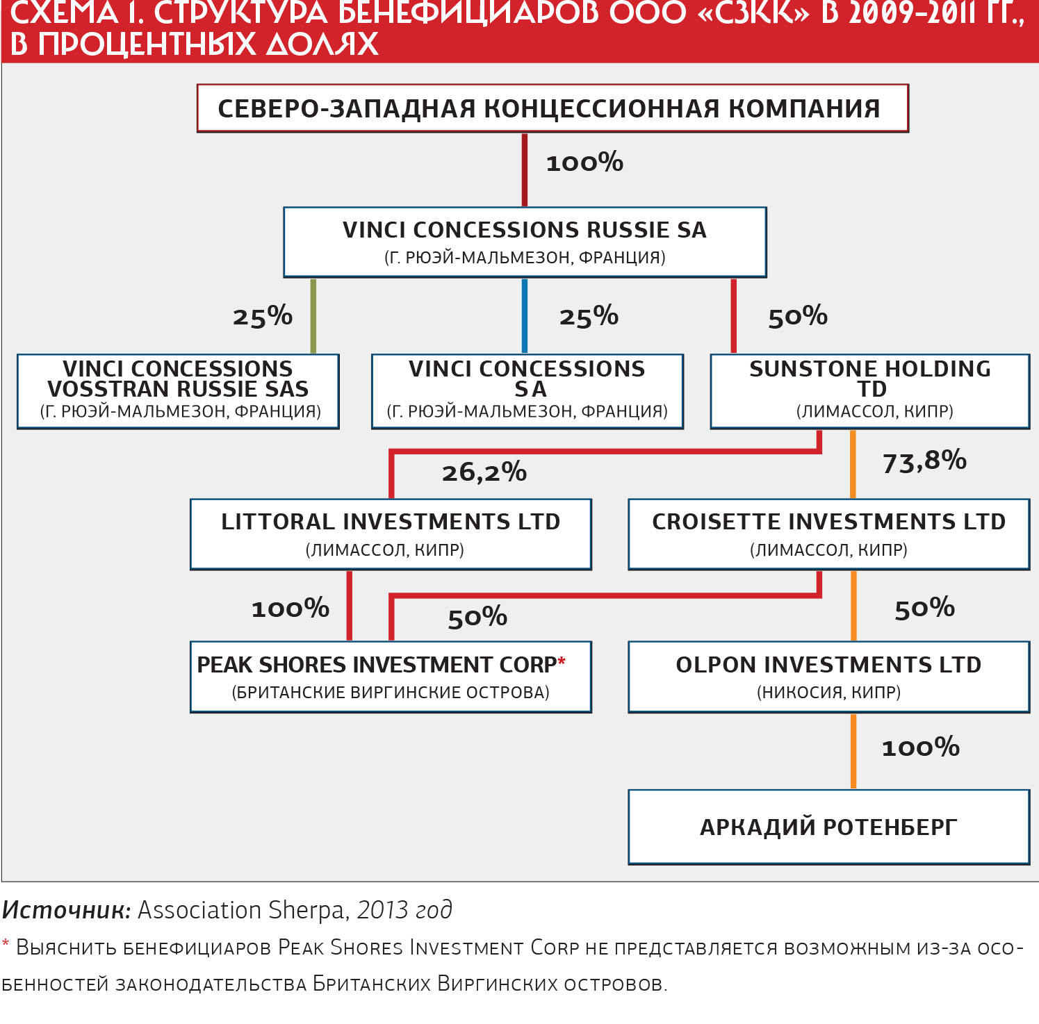 Материалы в прокуратуру Парижа (а заодно и в корпус следственных судей префектуры Нантер, где зарегистрирована участвовавшая в российском проекте дочерняя компания группы Vinci) направила французская некоммерческая юридическая ассоциация Sherpa, специализирующаяся на экономических преступлениях. Ее иск касается проекта строительства 43-километрового платного участка скоростной дороги М11 Москва — Санкт-Петербург через Химкинский лес. Проект, как известно, был реализован, несмотря на многочисленные протесты жителей Химок, пик которых пришелся на лето-осень 2010 года. В иске Sherpa выдвигает предположение: дорогу было решено строить после того, как французский подрядчик в лице Vinci, вероятно, поделился долями в «Северо-Западной концессионной компании» (СЗКК), специально учрежденной для строительства трассы, с людьми из ближайшего окружения Владимира Путина, в частности с бизнесменом Аркадием Ротенбергом.