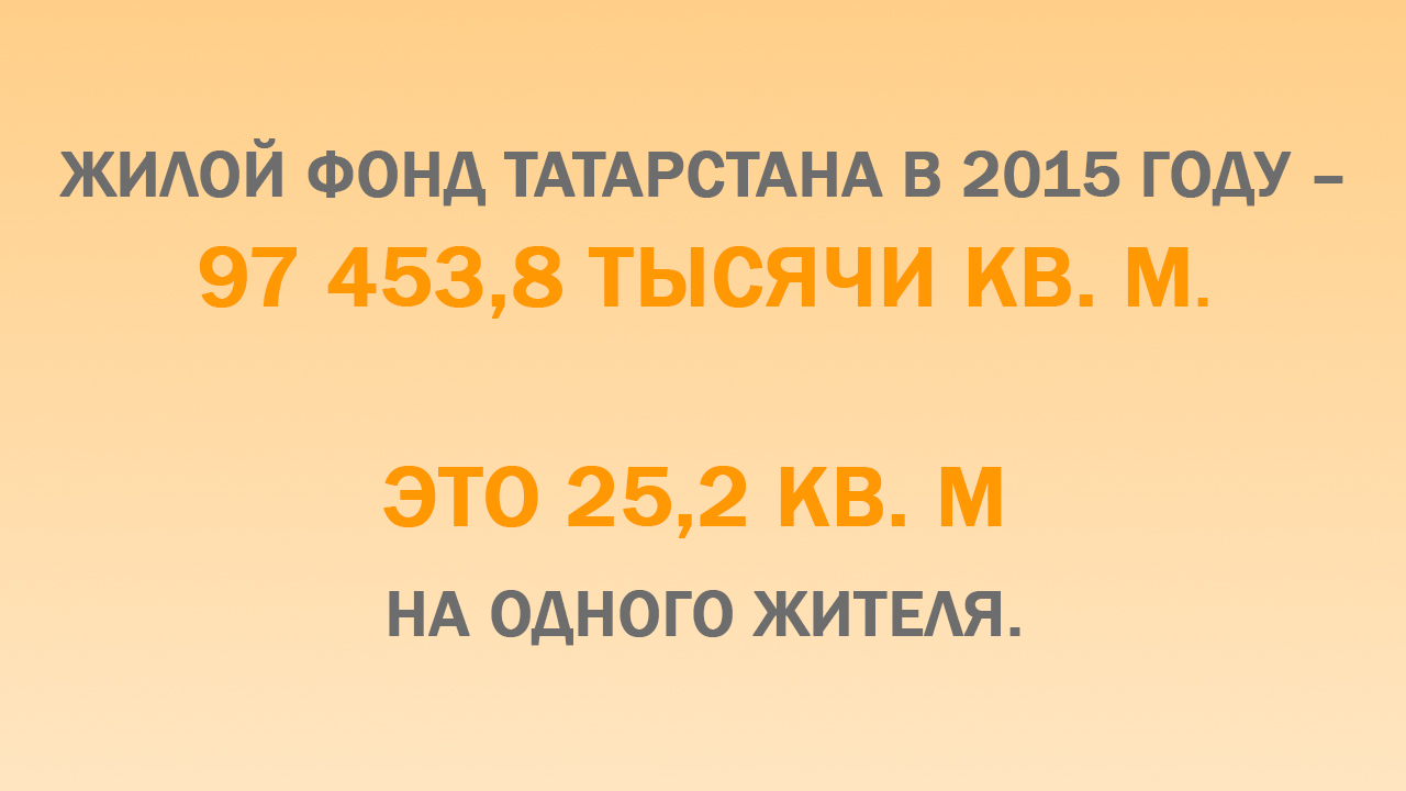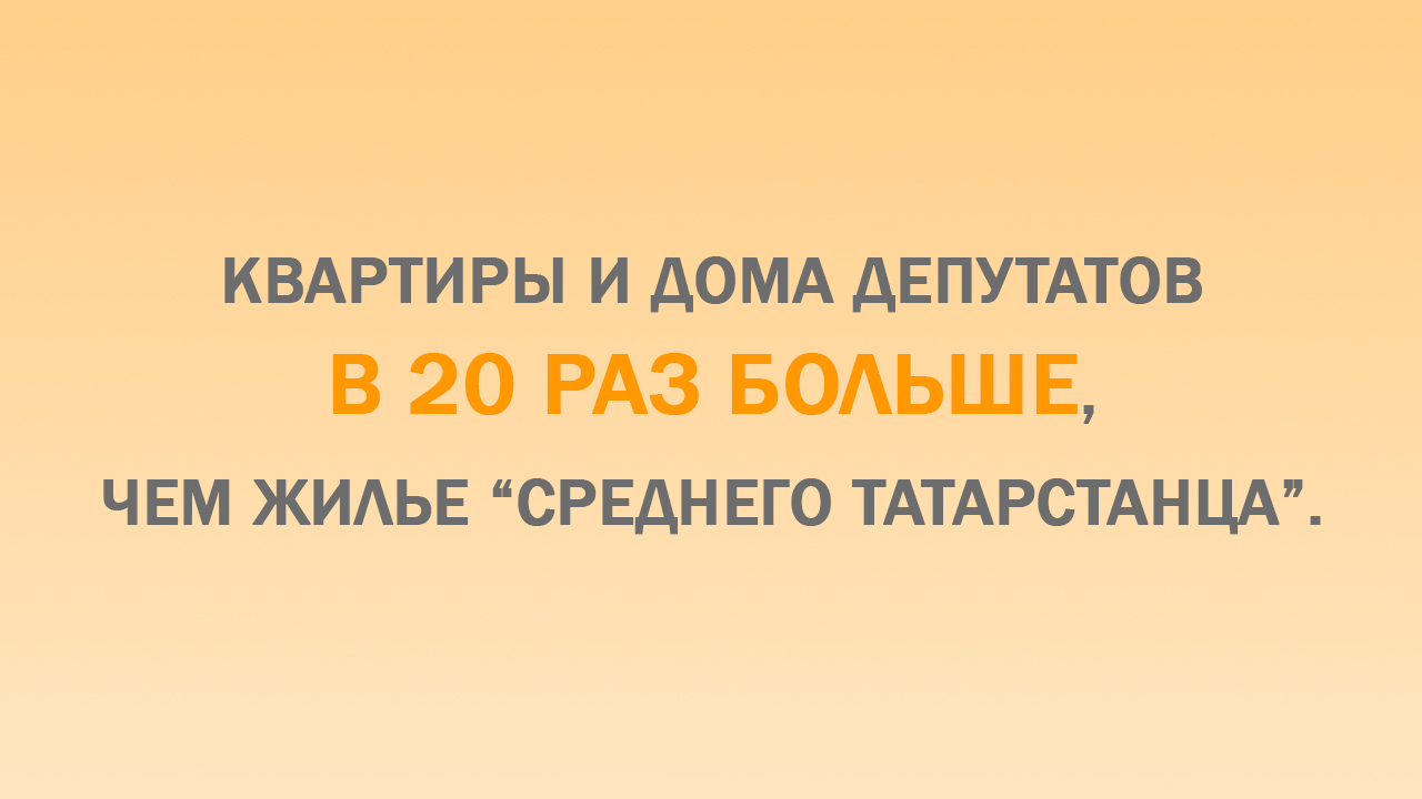 Жилой фонд Татарстана в 2015 году (данные пока есть только за этот год) составил 97 453,8 тыс. квадратных метров. Это по 25,2 "квадратов" на одного жителя. Таким образом, квартиры и дома народных избранников в 20 раз просторнее, чем у того самого народа. А если смотреть по пропорциям, то сто депутатов владеют 0,05% всего Жилфонда республики. А они, напоминаем, всего лишь 0,003% населения республики.
